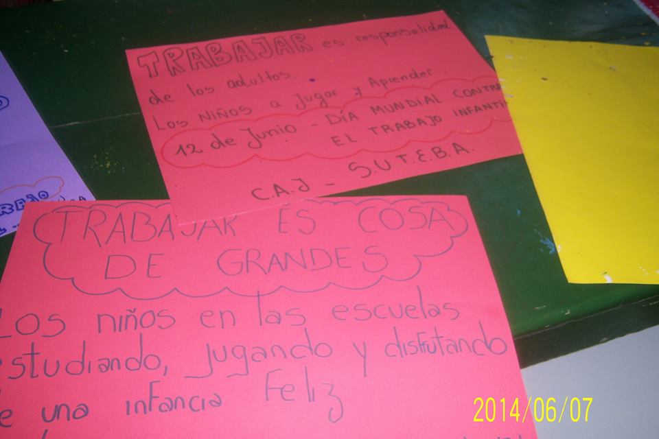 En vísperas del Día Mundial contra el Trabajo Infantil que se conmemora el 12 de junio, el CAJ (Centro de Actividades Juveniles) junto a la Secretaría de Derechos Humanos de SUTEBA SALIQUELLO, organizaron una jornada de reflexión y difusión sobre esta problemática.