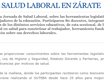 El cierre de la actividad estuvo a cargo del Secretario General de SUTEBA Zárate, Christian Poli, quien recordó que “la salud es un derecho social, individual e indelegable. La salud laboral no es un lujo, es un derecho que está en relación con las condiciones de trabajo. Un trabajador informado, es un trabajador más seguro y protagonista indispensable en la discusión sobre sus derechos laborales. Poli agregó: “desde la conformación de SUTEBA, hace 25 años, la Salud Laboral es parte de nuestra lucha en las paritarias y en la legislación laboral y social.”