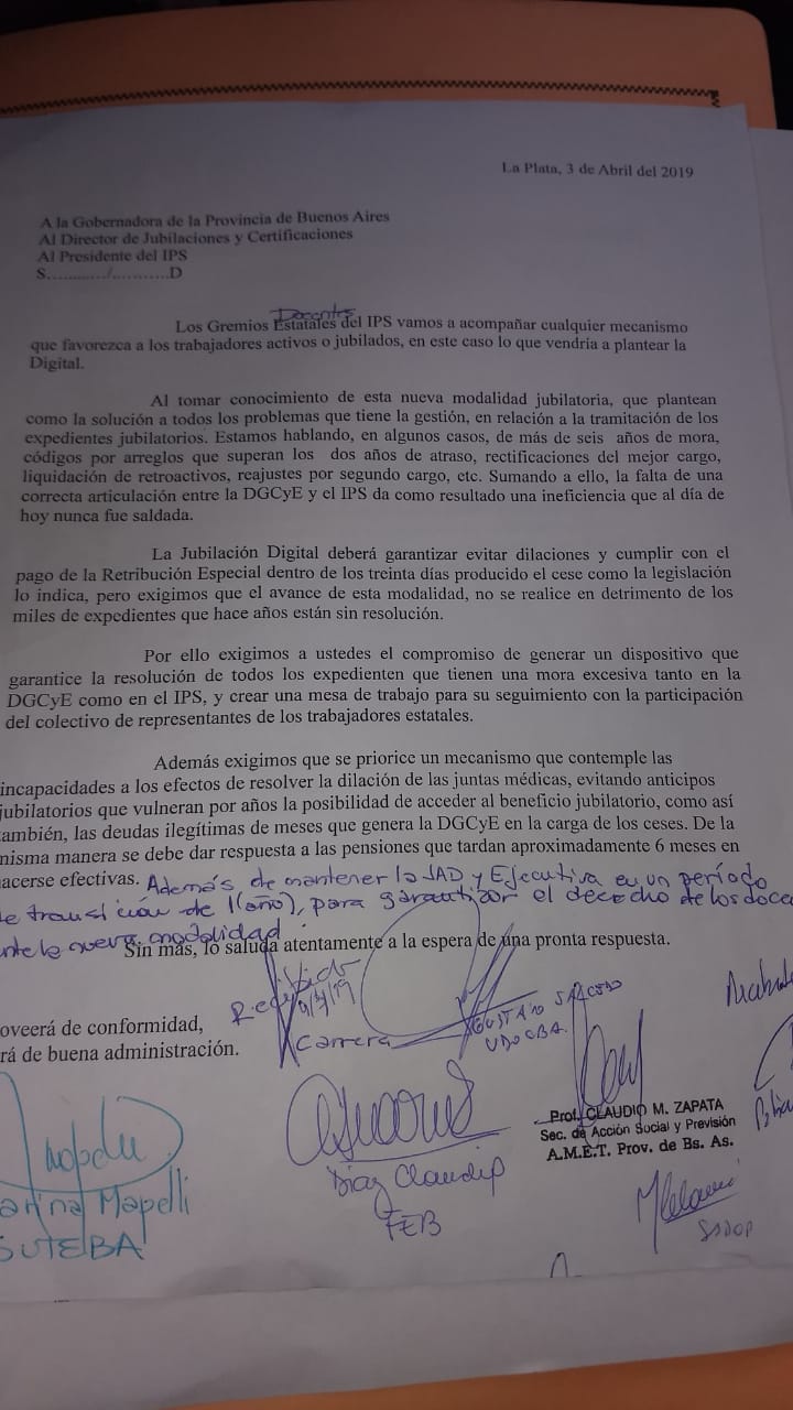 Con la presentación de la nota, se adjuntó una carpeta reclamando el tratamiento urgente de los miles de expedientes demorados y se pidió que se sostengan la JAD y la Ejecutiva en un período de transición que permita a lxs Docentes garantizar en tiempo y forma su jubilación.
