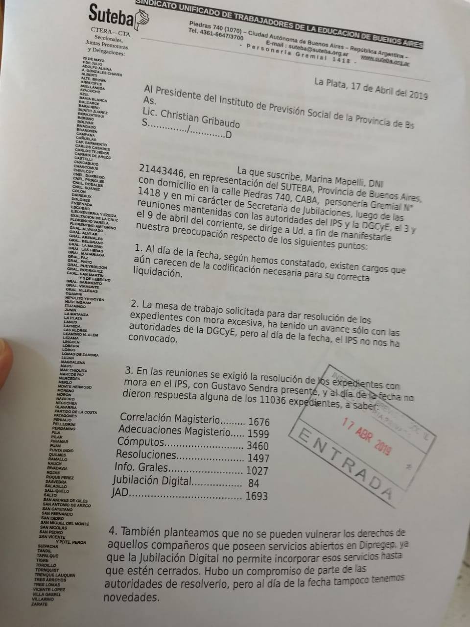 Hoy, miércoles 17 de abril, la Secretaria de Jubilaciones del SUTEBA, Marina Mapelli, hizo entrega a la Presidencia del IPS de una nota solicitando que se convoque de manera urgente a las Organizaciones Gremiales para informar respecto al avance del tratamiento de las problemáticas planteadas por el Frente de Unidad Docente Bonaerense en las reuniones mantenidas el 3 y el 9 de abril.