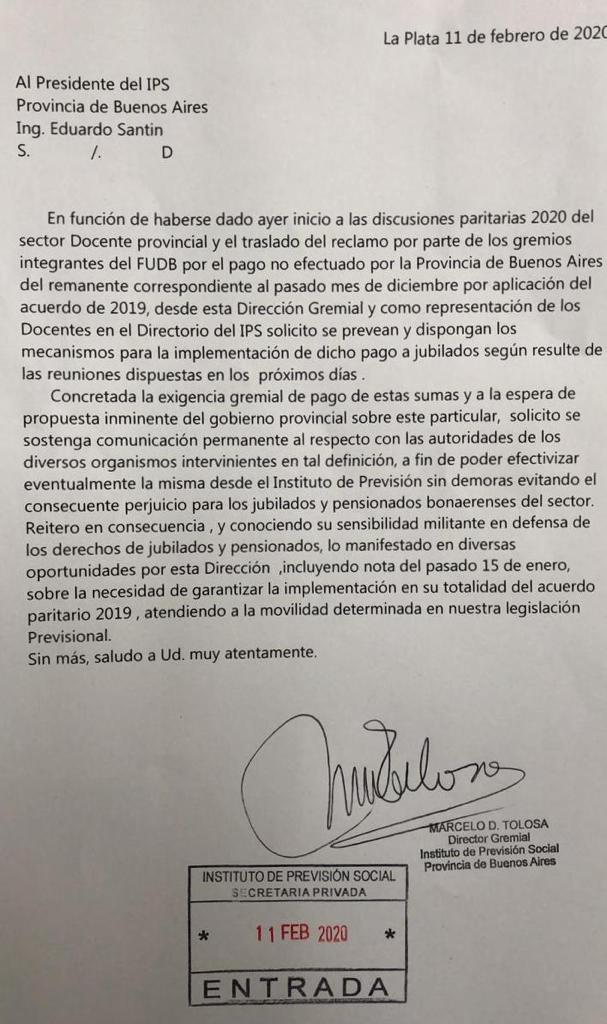 En consonancia con el reclamo gremial reiterado al inicio de la Paritaria por el Frente de Unidad Docente Bonaerense en relación al pago del remanente adeudado de diciembre y el proporcional del SAC; la Representación Gremial Docente en el IPS elevó un escrito el 11 de febrero al Presidente del Instituto, Eduardo Santín, demandando el pago de los mencionados montos.