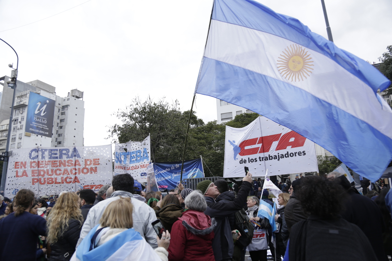 Lxs Docentes, con una multitud que llevaba sus banderas argentinas, convocada por sindicatos, movimientos sociales y estudiantiles, organismos de Derechos Humanos, clubes de barrio y PyMES, entre otros colectivos, volvimos este lunes a manifestarnos en las calles de la Ciudad en contra del acuerdo con el Fondo Monetario Internacional y el brutal ajuste.