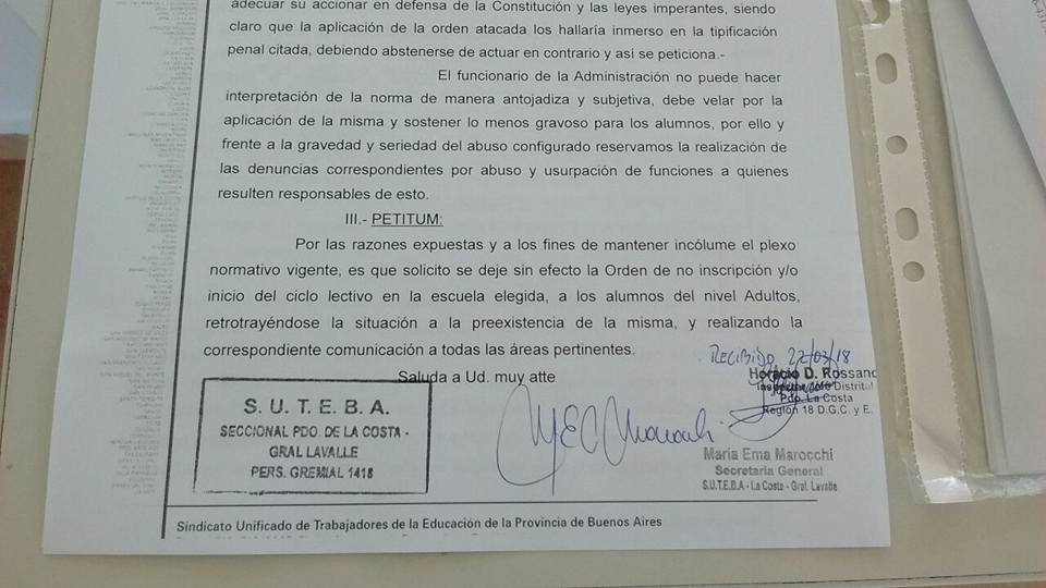 La Secretaria General del SUTEBA La Costa - General Lavalle, María Ema Marocchi, se hizo presente en el día de hoy en la Jefatura Distrital de La Costa para impugnar la resolución provincial que elimina los Bachilleratos de Adultxs y cesa a Docentes.