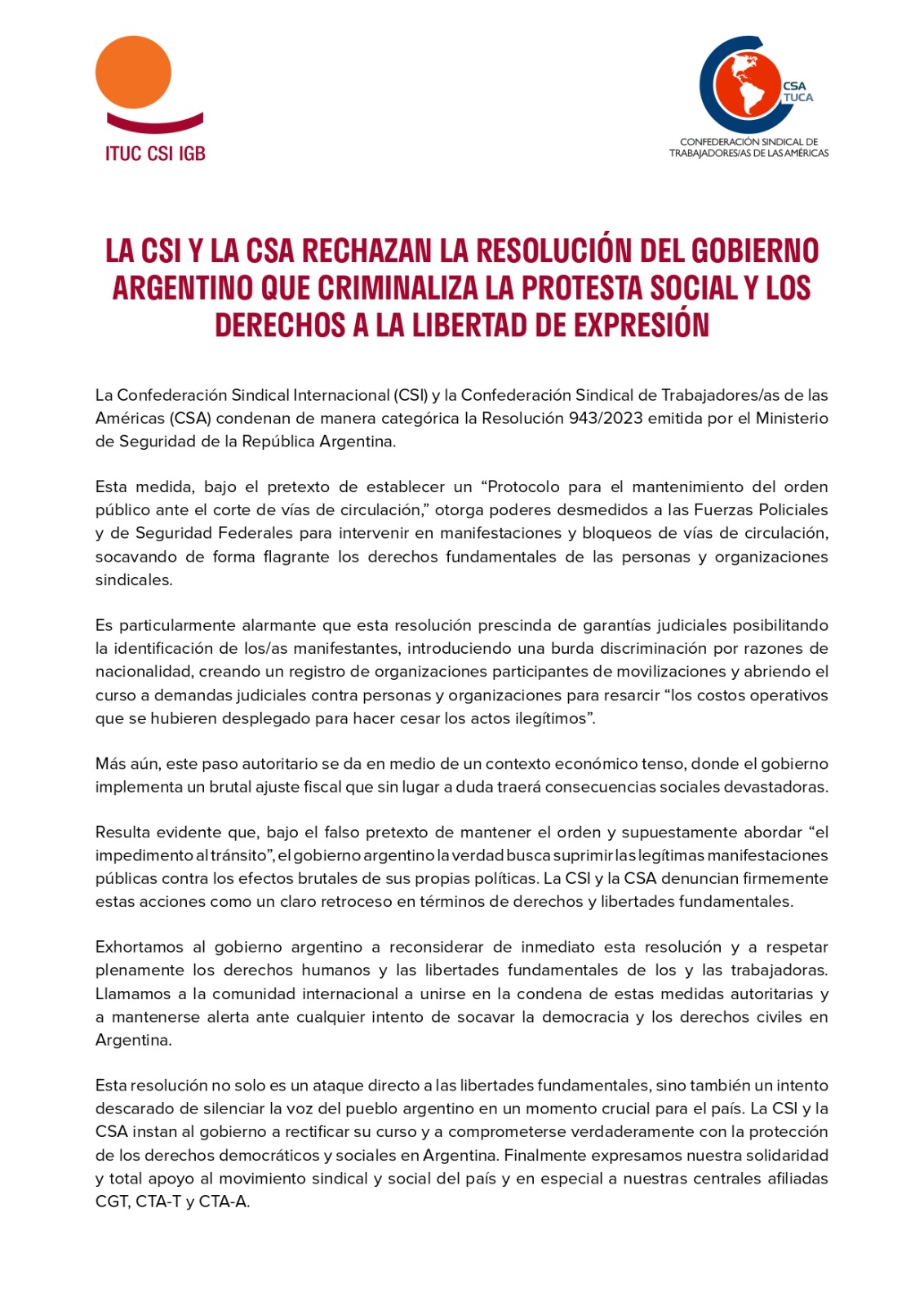 La Confederación Sindical Internacional (CSI) y la Confederación Sindical de Trabajadores/as de las Américas (CSA) condenan de manera categórica la Resolución 943/2023 emitida por el Ministerio de Seguridad de la República Argentina. Esta medida, bajo el pretexto de establecer un "Protocolo para el mantenimiento del orden público ante el corte de vías de circulación," otorga poderes desmedidos a las Fuerzas Policiales y de Seguridad Federales para intervenir en manifestaciones y bloqueos de vías de circulación, socavando de forma flagrante los derechos fundamentales de las personas y organizaciones sindicales. Es particularmente alarmante que esta resolución prescinda de garantías judiciales posibilitando la identificación de los/as manifestantes, introduciendo una burda discriminación por razones de nacionalidad, creando un registro de organizaciones participantes de movilizaciones y abriendo el curso a demandas judiciales contra personas y organizaciones para resarcir "los costos operativos que se hubieren desplegado para hacer cesar los actos ilegítimos". Más aún, este paso autoritario se da en medio de un contexto económico tenso, donde el gobierno implementa un brutal ajuste fiscal que sin lugar a duda traerá consecuencias sociales devastadoras. Resulta evidente que, bajo el falso pretexto de mantener el orden y supuestamente abordar "el impedimento al tránsito", el gobierno argentino la verdad busca suprimir las legítimas manifestaciones públicas contra los efectos brutales de sus propias políticas. La CSI y la CSA denuncian firmemente estas acciones como un claro retroceso en términos de derechos y libertades fundamentales. Exhortamos al gobierno argentino a reconsiderar de inmediato esta resolución y a respetar plenamente los derechos humanos y las libertades fundamentales de los y las trabajadoras. Llamamos a la comunidad internacional a unirse en la condena de estas medidas autoritarias y a mantenerse alerta ante cualquier intento de socavar la democracia y los derechos civiles en Argentina. Esta resolución no solo es un ataque directo a las libertades fundamentales, sino también un intento descarado de silenciar la voz del pueblo argentino en un momento crucial para el país. La CSI y la CSA instan al gobierno a rectificar su curso y a comprometerse verdaderamente con la protección de los derechos democráticos y sociales en Argentina. Finalmente expresamos nuestra solidaridad y total apoyo al movimiento sindical y social del país y en especial a nuestras centrales afiliadas CGT, CTA-T y CTA-A.