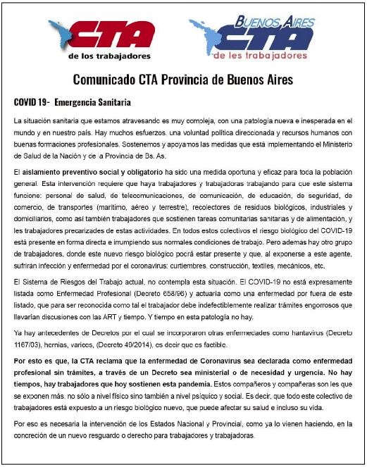 Lilian Capone, Secretaria de Salud Laboral de la CTA Provincia de Buenos Aires, sostuvo al respecto: "Estamos preocupadxs porque hay Trabajadorxs expuestxs directamente al riesgo de contagio y exponen su vida con este virus muy peligroso. Planteamos que el coronavirus sea considerado como enfermedad profesional y que toda su cobertura de tratamiento, rehabilitación y posible incapacidad sean contempladas por Aseguradoras de Riesgos del Trabajo. Actualmente, la definición de la Superintendencia de Riesgos del Trabajo es que la enfermedad profesional es reconocida caso por caso con trámites que deben hacer lxs Trabajadorxs. Estamos en una emergencia, no hay tiempo para trámites".