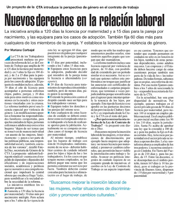 La CTA de los Trabajadores presentará mañana un proyecto de reforma de la Ley de Contrato de Trabajo que amplía de 90 a 120 días la licencia por maternidad (y en 3 años la fija en 180 días), y de 2 a 15 días para la pareja por nacimiento y las equipara para los casos de adopción. El paquete de medidas incluye, además, 30 días al año de licencia para acompañar a personas enfermas (hijos, padres, pareja), y 20 días más para otros motivos como reuniones en la escuela y otras cuestiones vinculadas con la crianza. La reforma también prevé una licencia especial por violencia de género. Las modificaciones apuntan a fomentar las responsabilidades familiares compartidas, para que los cuidados de hijos, personas enfermas o adultos mayores en los hogares "dejen de ser temas que se resuelven de manera individual –un asunto de las mujeres, históricamente– y pasen a ser parte de las políticas públicas, una responsabilidad social y, también, una tarea de los varones", detalló Estela Díaz, secretaria de Género de la CTA. La propuesta –adelantó la dirigente sindical– cuenta con el respaldo de diputadas y diputados del oficialismo y de organizaciones sociales, académicas y políticas que se sumarán a una campaña nacional que impulsará la central obrera que encabeza Hugo Yasky, para sensibilizar a la sociedad sobre la necesidad de la reforma.