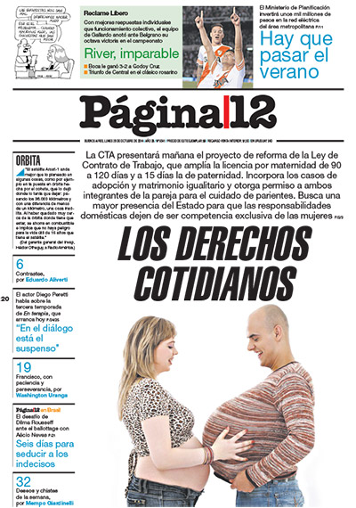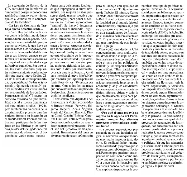 –Claro. Hay que adecuarla a leyes como la de Matrimonio Igualitario o Identidad de género. Además, hay gran cantidad de parejas que no conviven, lo que lleva en muchos casos a los papás a encontrarse con la imposibilidad de cuidar a sus hijos/as cuando se enferman, ir a reuniones escolares o acompañarlos en actividades significativas para ellos. Por otro lado, las modificaciones propuestas están en sintonía con la inclusión que hace el nuevo Código Civil de la idea de corresponsabilidad o parentalidad. No hay más tenencia y régimen de visitas. Ni padres ni madres son visita: ambos son responsable de los cuidados. Porque además la LCT nace en un contexto histórico de gran movilidad social y fuerza organizada del movimiento sindical (1974), pero también nos da cuenta de la discriminación presente para las mujeres frente a su inserción en el ámbito laboral. Por más que había gran participación de las mujeres en las fábricas y los servicios, la idea del trabajador neutral en términos de género –con el hegemónico varón como modelo– forma parte del sustrato ideológico que impregnaba la nueva normativa. Las mujeres estaban presentes desde una perspectiva que las "protegía", para poner el centro en su función reproductora "natural". Se incluyó descansos de dos horas al mediodía –algunas observadoras como chiste sostienen que era un permiso para hacer el almuerzo en la casa– y la protección contra insalubridad y trabajo forzoso. Aspectos que deben ser reivindicaciones para trabajadores de cualquier sexo. Luego está el capítulo de la "protección de la maternidad", que otorga aspectos de cuidado sólo para las mujeres, dejando a los varones sólo 2 días por nacimiento, pensada para ir al Registro Civil para inscribir el nuevo hijo/a. Hay que recordar que la patria potestad hasta fines de los ’80 estaba era paterna. Con todos los avances que hubo estos años en ampliación de derechos, claramente éste es un capítulo pendiente.
