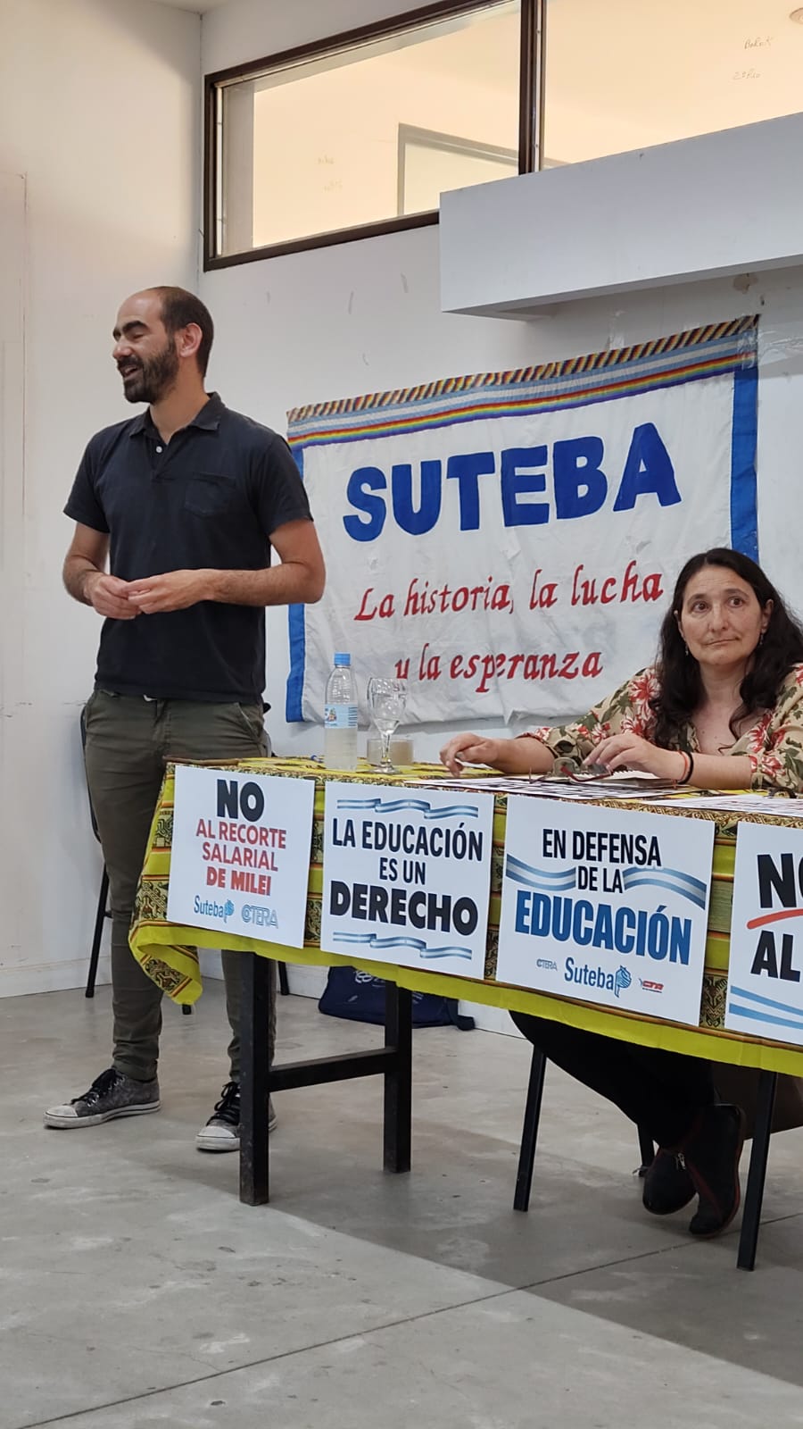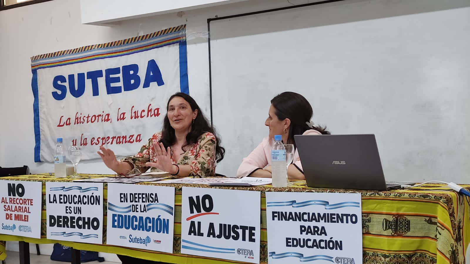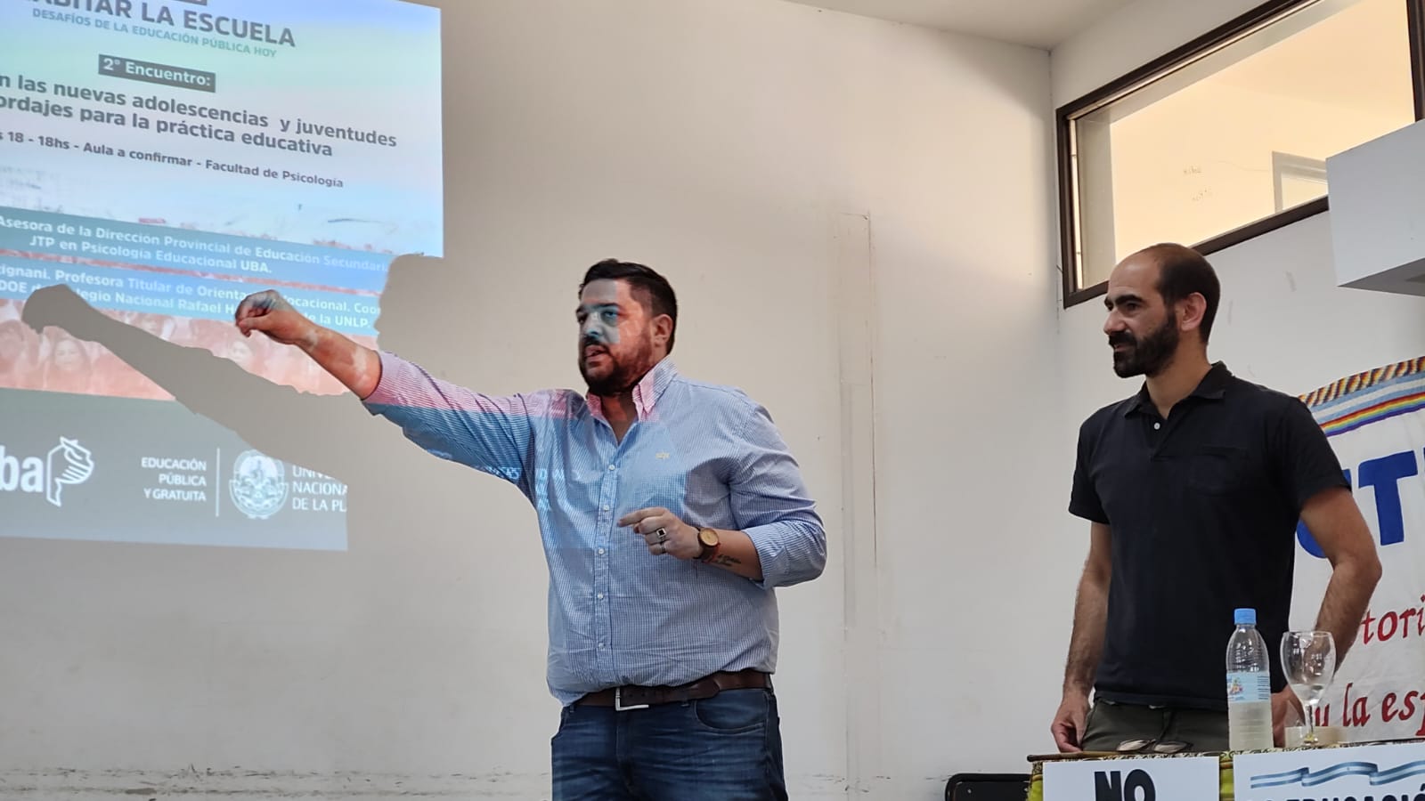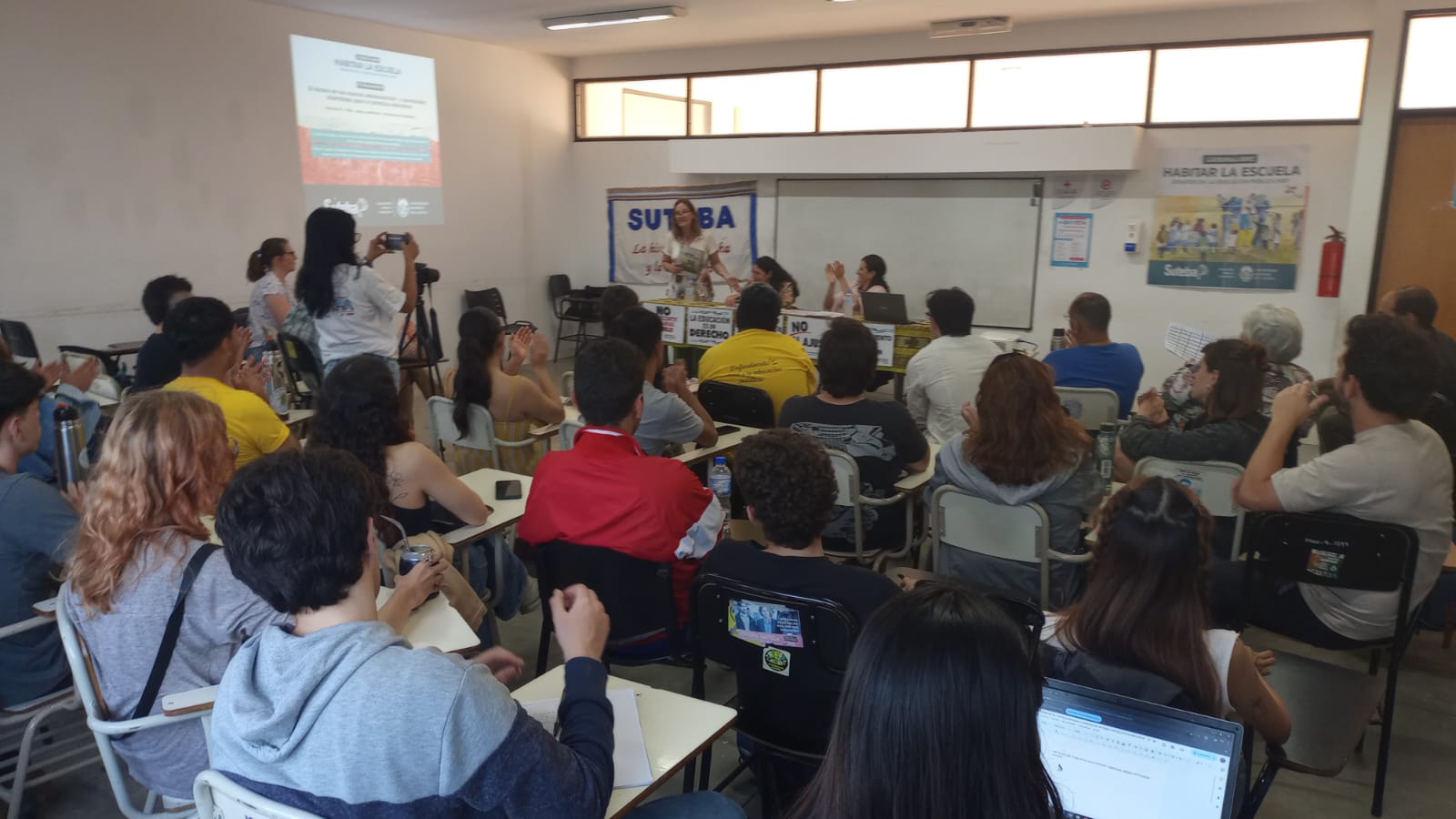 También estuvieron presentes compañerxs del Consejo Ejecutivo Provincial del SUTEBA, como Mariana Cattaneo y Dante Boeri; lxs compañerxs del CES del SUTEBA La Plata con Juliana Alessandro, Secretaria General Adjunta, Adelina Petón y Ezequiel Asprella, a cargo de esta cátedra con la que nos proponemos tender un puente hacia lxs Estudiantes en formación y acercarles tempranamente los debates y desafíos que hoy atraviesan a la Escuela Pública.
