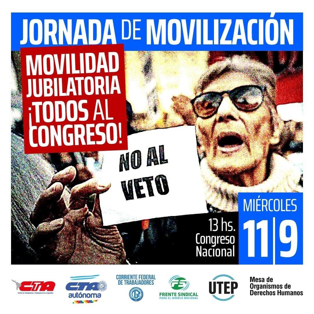 Dirigentes de la CTA de lxs Trabajadorxs, CTA Autónoma, Frente Sindical por el Modelo Nacional y Corriente Federal de lxs Trabajadorxs, por la CGT; la UTEP, movimientos sociales, pequeñas y medianas empresas y Diputadxs Nacionales anunciaron una jornada de movilización a realizarse el jueves 12 de septiembre frente al Congreso, en repudio al veto presidencial a la Ley que modifica la movilidad jubilatoria y para que lxs Diputadxs ratifiquen con dos tercios la decisión del Poder Legislativo de recomponer parte del poder adquisitivo perdido desde que asumió el Gobierno de Milei.