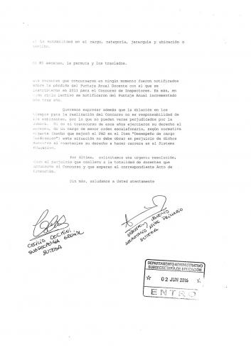 En la nota entregada al Subsecretario Sergio Siciliano, SUTEBA solicita una urgente respuesta a los Recursos jerárquicos en Subsidio que fueron entregados por concursantes. Dichos docentes ven lesionados sus derechos, dado que les permitieron cambiar la base por la cual se inscribieron pero "sin puntaje" al momento de realizar el promedio final.