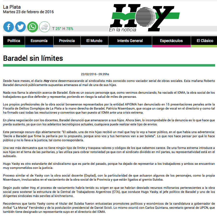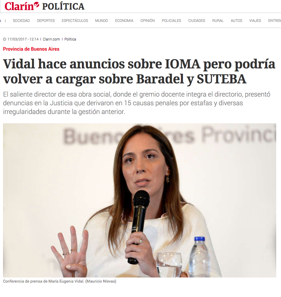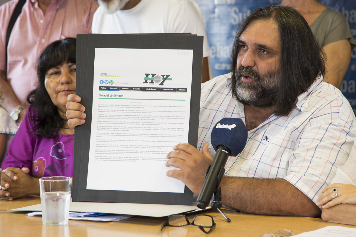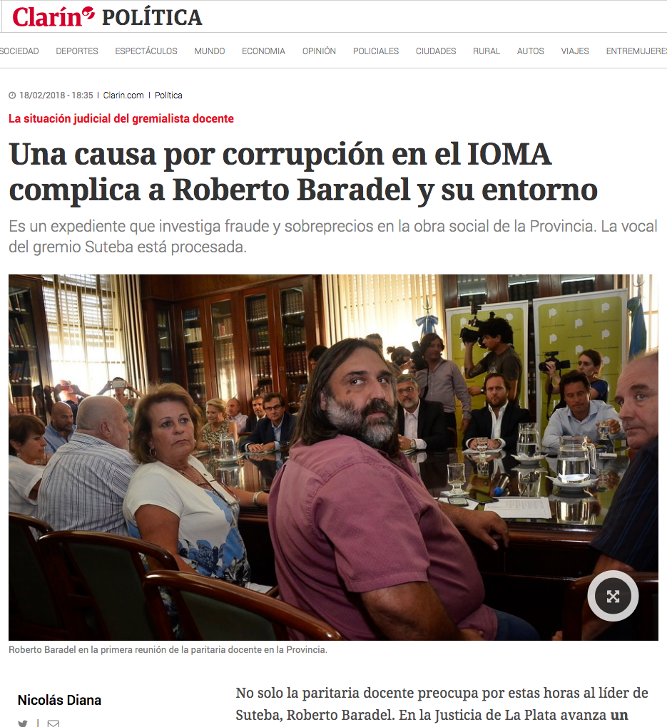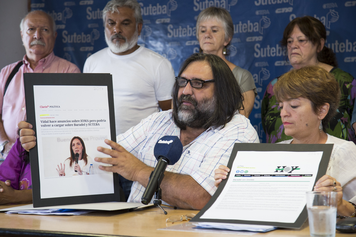 Frente a la mentirosa campaña mediática que se desata cada vez que hay Paritarias y a las falsas acusaciones repetidas sistemáticamente en febrero de 2016, 2017 y 2018 por los diarios Hoy y Clarín; Baradel presentó los documentos que excluyen al SUTEBA y a su vocal de los actos ilícitos en el IOMA. Asimismo, se probó también que el SUTEBA le exigió desde el 2016 al Gobierno que aclare la situación del Instituto y haga públicas, como debe ser, las auditorías y la deuda del Gobierno con el IOMA.