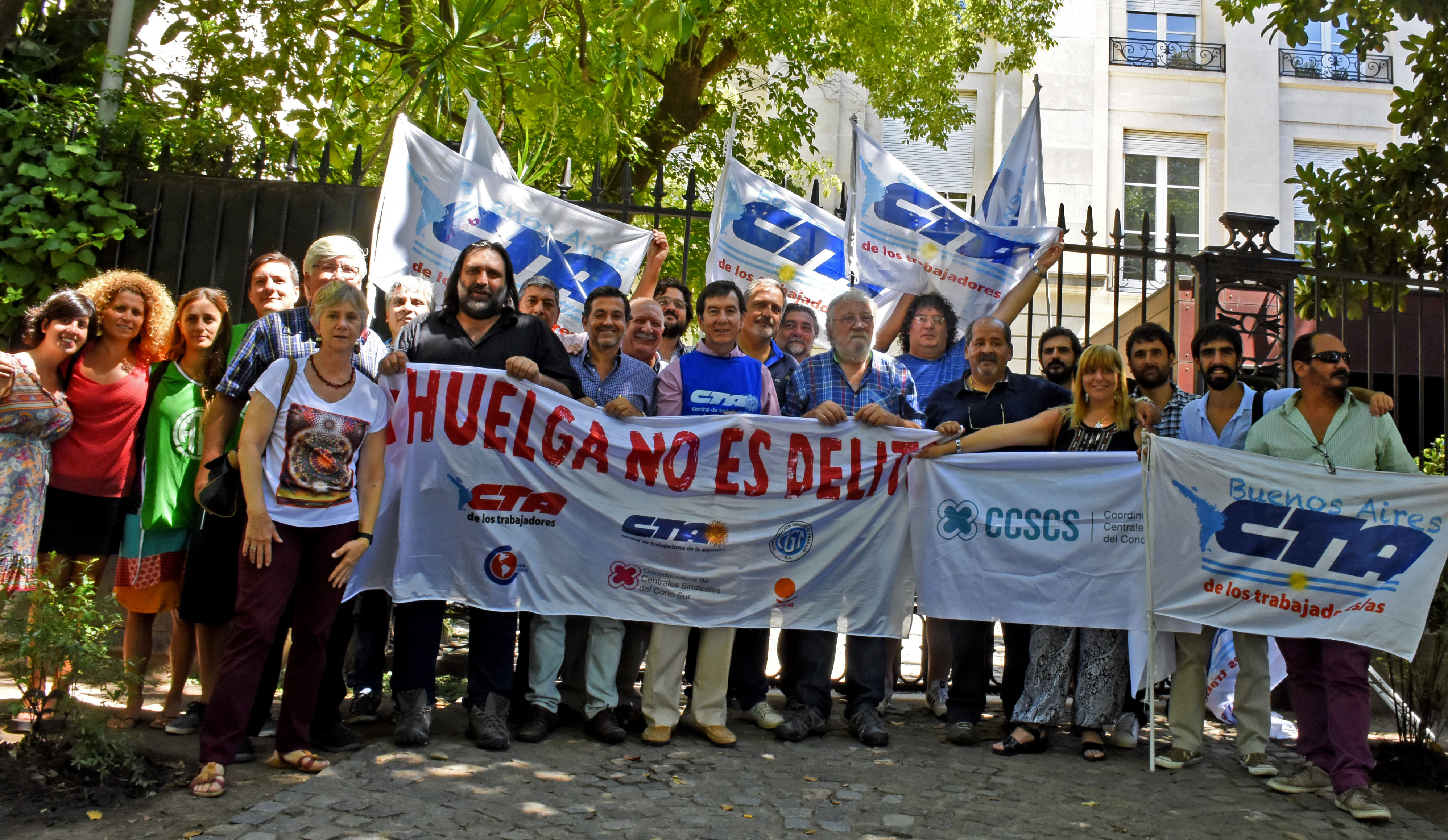 En ese sentido, el Secretario de Relaciones Internacionales de la CTA de los Trabajadores, Roberto Baradel, junto a Adolfo Aguirre (CTA Autónoma) y Antonio Jara (CCSCS) hicieron entrega de un documento al Embajador Estanislao de Grandes Pascual.