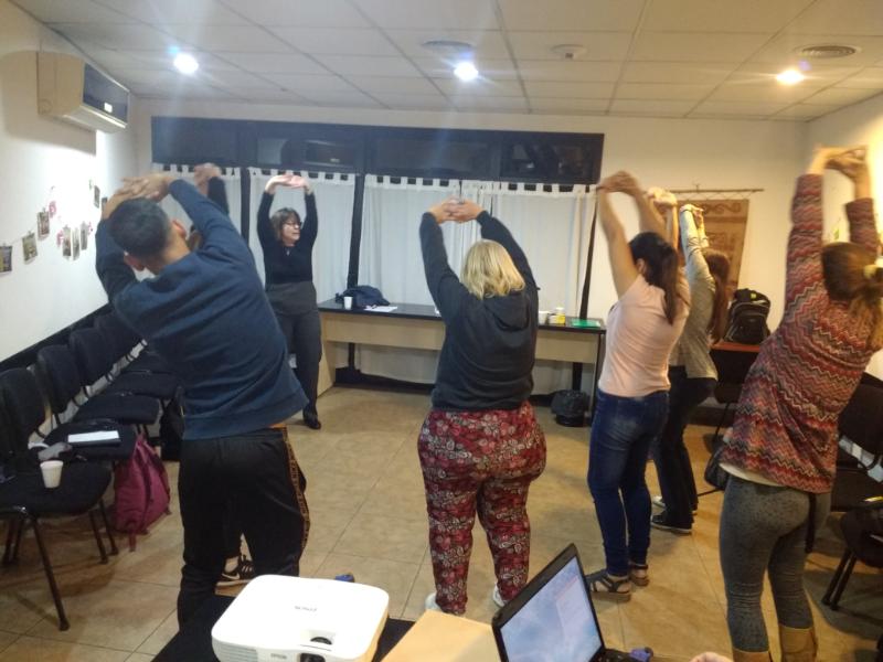 La Licenciada Alejandra Fernícola desarrolló el taller socializando el marco teórico y, posteriormente, trabajó con la implementación de diversas estrategias para el cuidado de la voz.