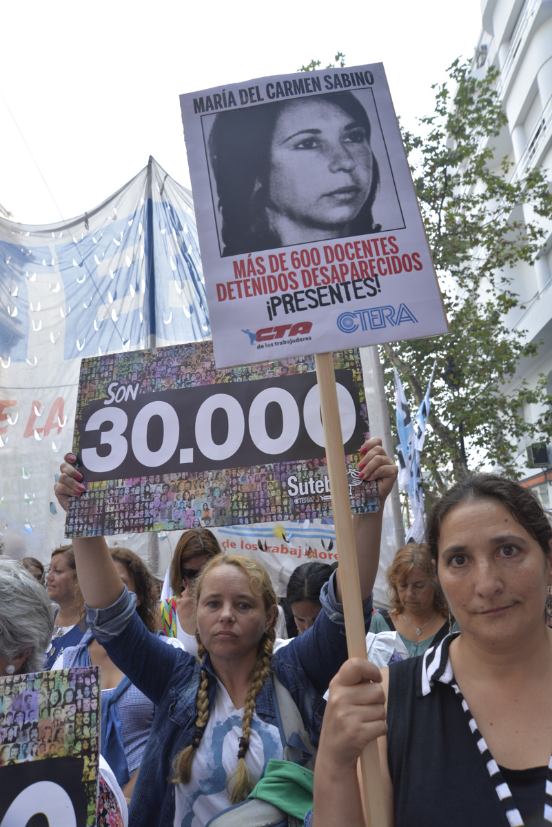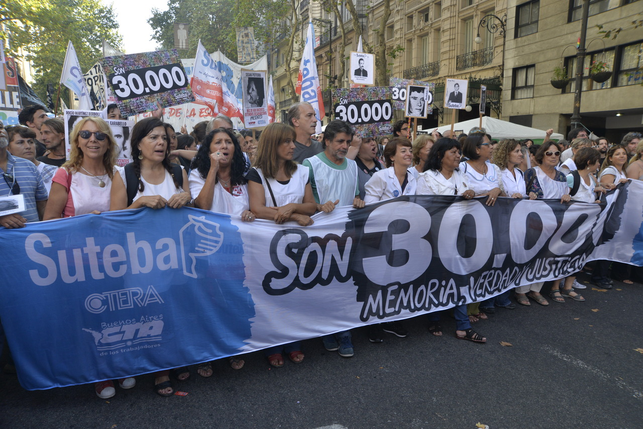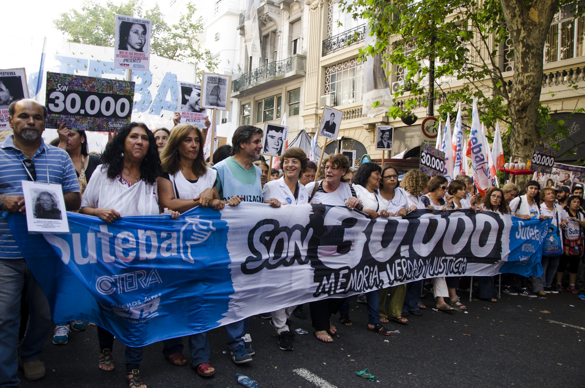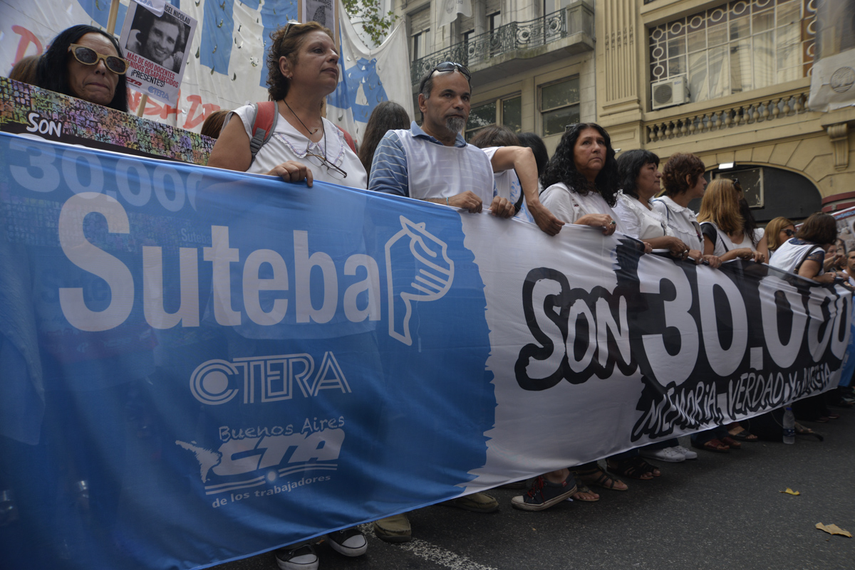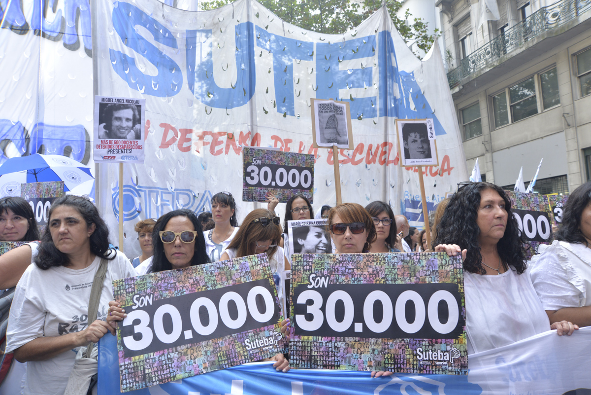 Desde el SUTEBA decimos con firmeza que son 30.000 los compañeros que nos faltan y por los que siempre vamos a marchar, continuamos exigiendo juicio, castigo, cárcel común y efectiva a los responsables civiles y militares, que en muchas instancias fueron beneficiados con prisión domiciliaria desde la llegada de este Gobierno. Además, rechazamos también los atropellos a las políticas de DDHH que realiza este Gobierno y decimos por esto ¡NI UN PASO ATRÁS!