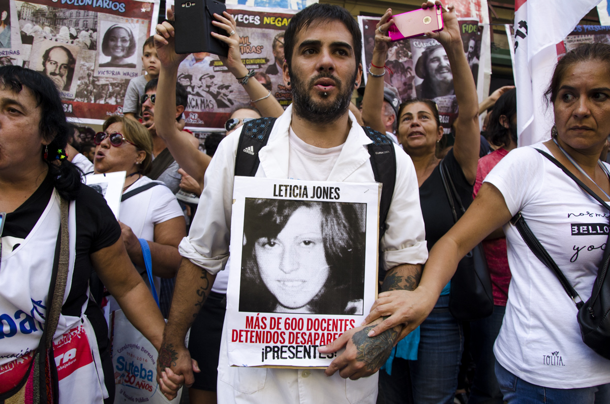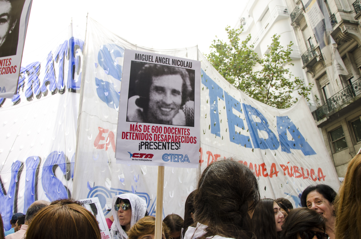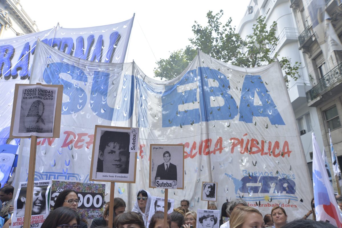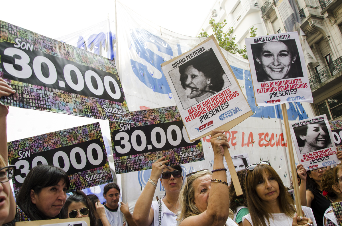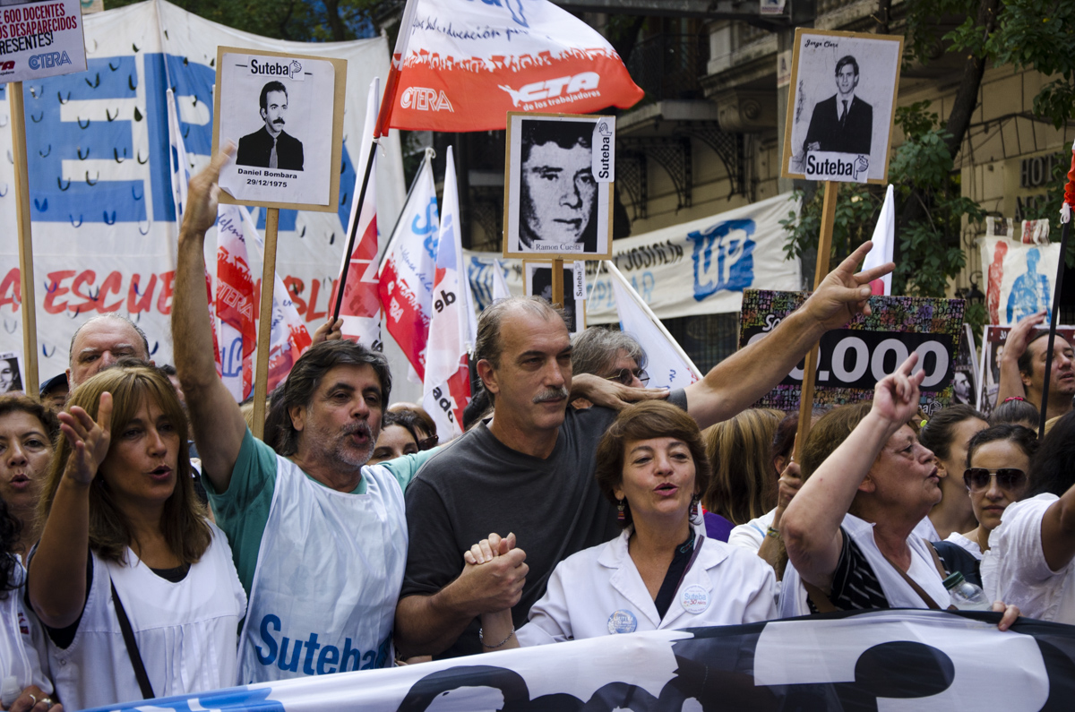 Desde el SUTEBA decimos con firmeza que son 30.000 los compañeros que nos faltan y por los que siempre vamos a marchar, continuamos exigiendo juicio, castigo, cárcel común y efectiva a los responsables civiles y militares, que en muchas instancias fueron beneficiados con prisión domiciliaria desde la llegada de este Gobierno. Además, rechazamos también los atropellos a las políticas de DDHH que realiza este Gobierno y decimos por esto ¡NI UN PASO ATRÁS!