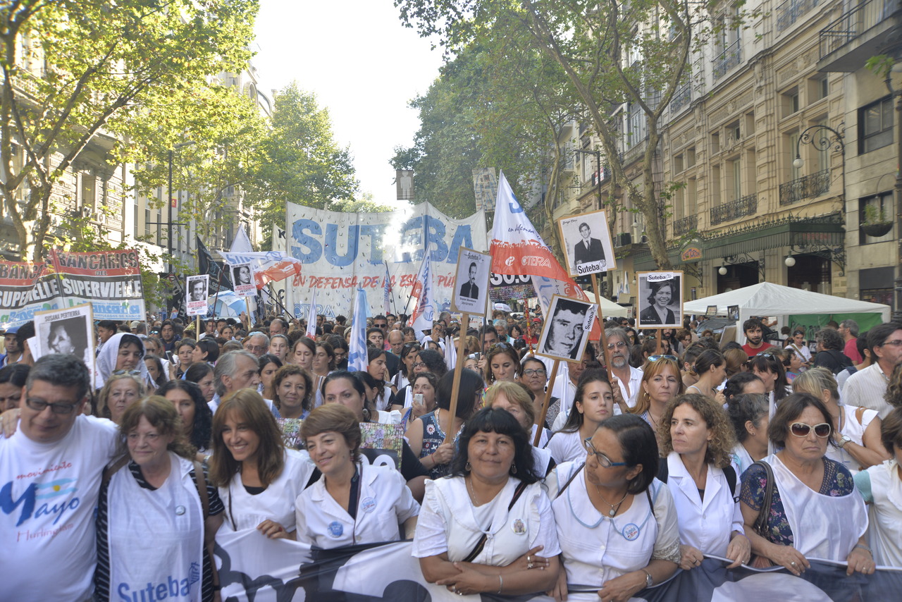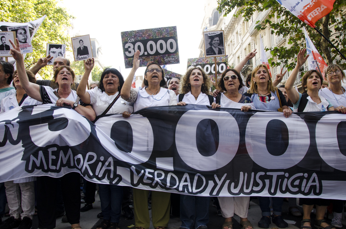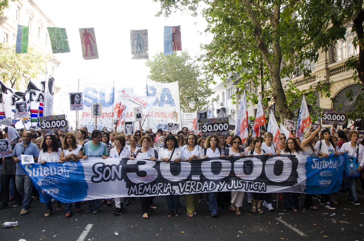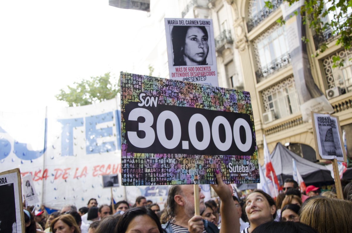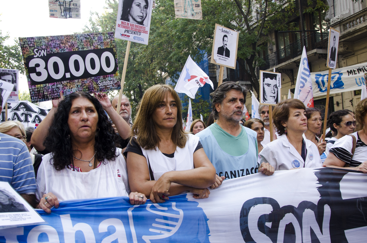 Desde el SUTEBA decimos con firmeza que son 30.000 los compañeros que nos faltan y por los que siempre vamos a marchar, continuamos exigiendo juicio, castigo, cárcel común y efectiva a los responsables civiles y militares, que en muchas instancias fueron beneficiados con prisión domiciliaria desde la llegada de este Gobierno. Además, rechazamos también los atropellos a las políticas de DDHH que realiza este Gobierno y decimos por esto ¡NI UN PASO ATRÁS!
