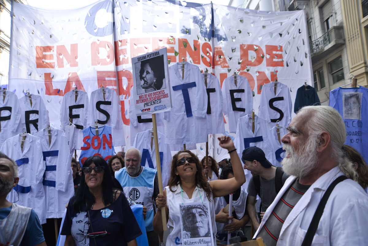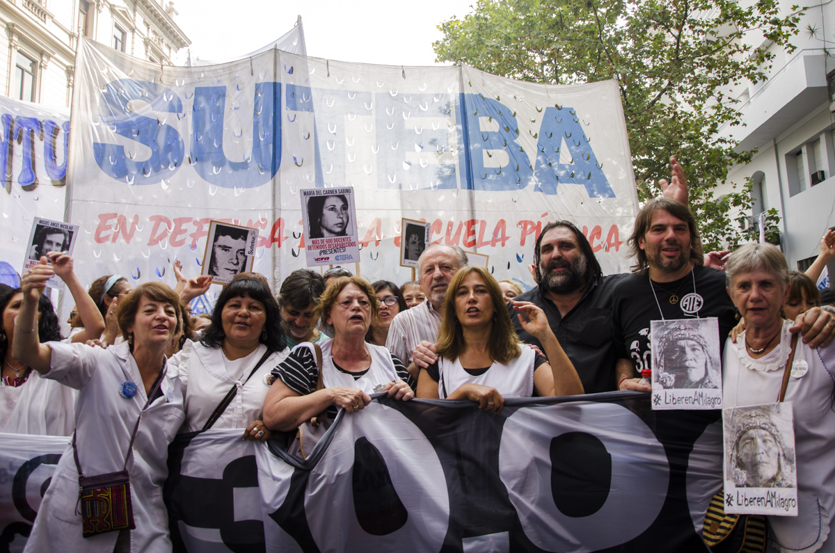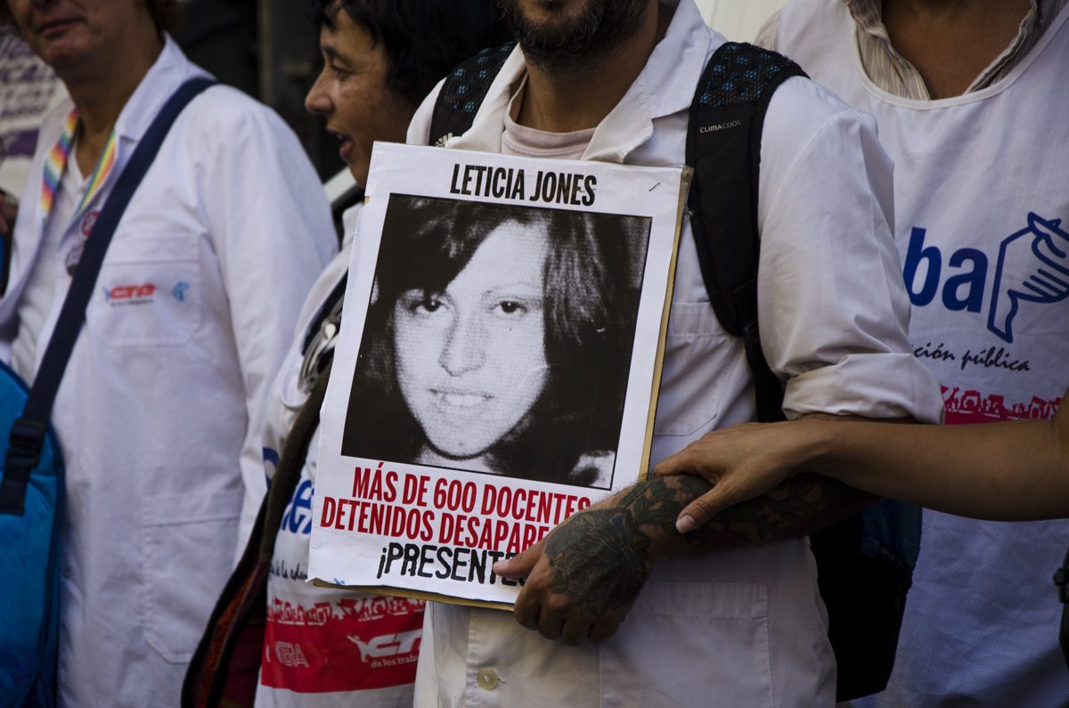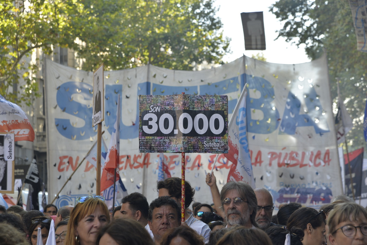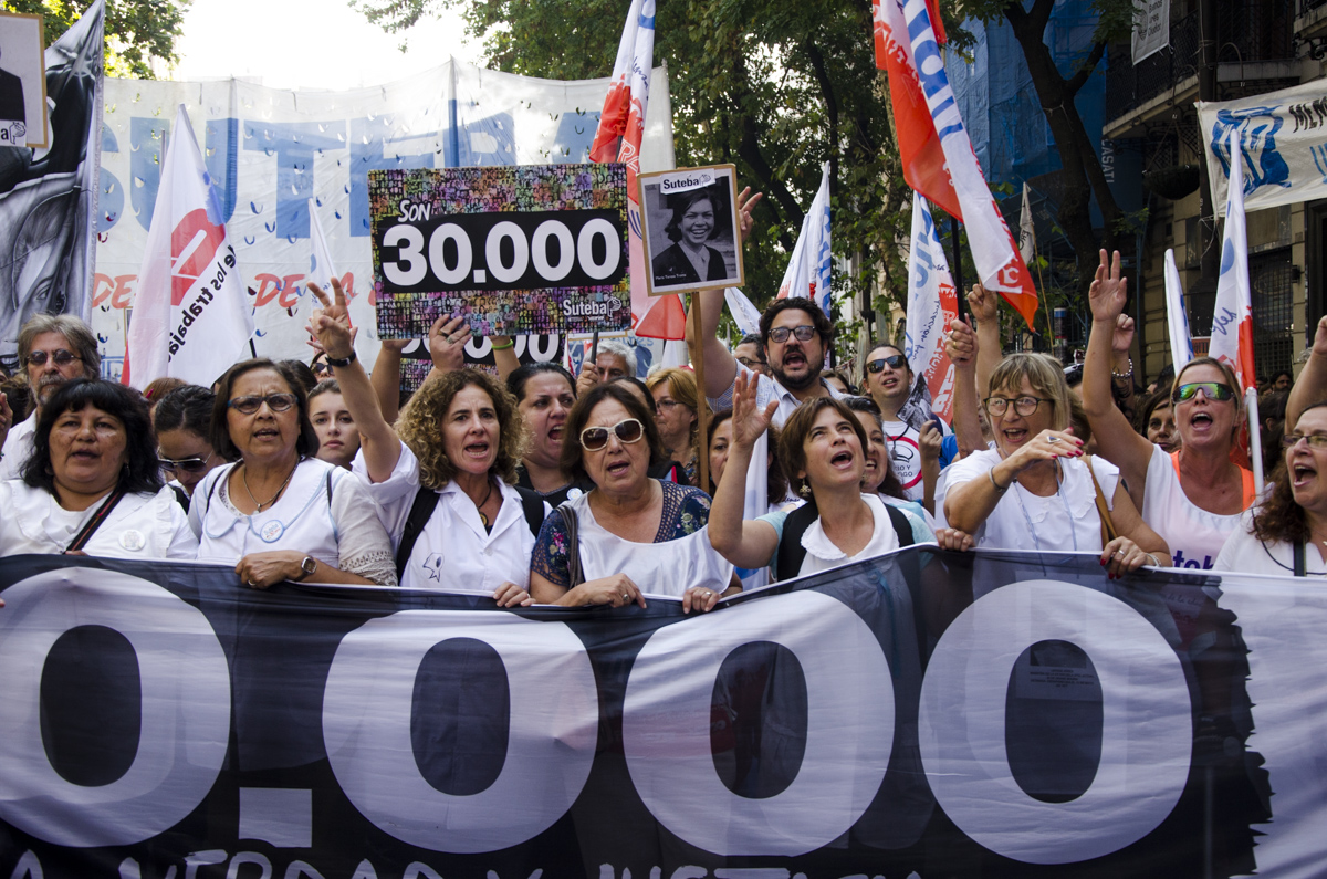 Desde el SUTEBA decimos con firmeza que son 30.000 los compañeros que nos faltan y por los que siempre vamos a marchar, continuamos exigiendo juicio, castigo, cárcel común y efectiva a los responsables civiles y militares, que en muchas instancias fueron beneficiados con prisión domiciliaria desde la llegada de este Gobierno. Además, rechazamos también los atropellos a las políticas de DDHH que realiza este Gobierno y decimos por esto ¡NI UN PASO ATRÁS!