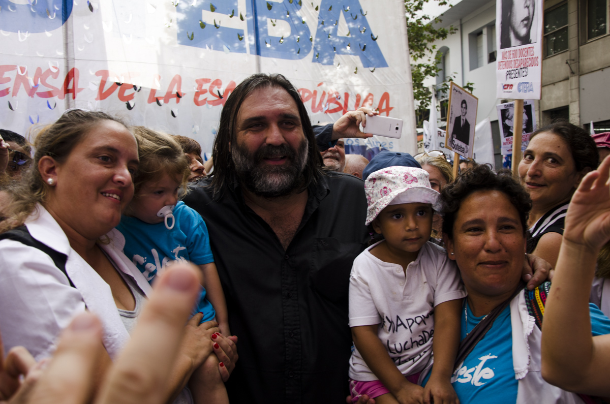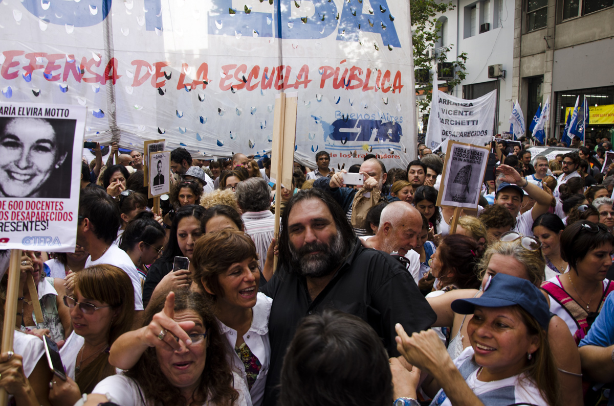Paulino Guarido, Secretario General de CTA La Matanza y sobreviviente del CDD "El Vesubio", expresó emocionado: "Nuestra presencia es para ratificar una vez más el camino de Memoria, Verdad y Justicia que construyó nuestro pueblo. Fueron 30.000 y están presentes con nosotros, lo digo como maestro de La Matanza, sobreviviente y testigo en los juicios por crímenes de lesa humanidad, juicios que el pueblo, la CTERA y SUTEBA llegaron a construir. Hoy es un mojón más en este camino que viene recorriendo nuestro pueblo. Como maestros, decimos que fueron 600 compañeros y que no vamos a apartarnos del reclamo por Memoria, Verdad y Justicia, que este gobierno los quiere negar. Estamos firmes acompañando a las Madres y Abuelas y firmes en la defensa de la Escuela Pública".