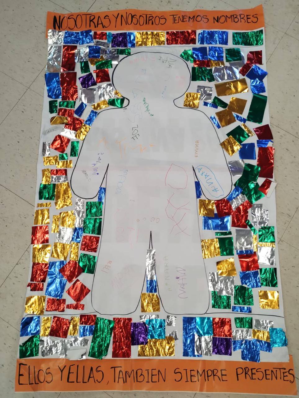 En Berisso, en el marco de la campaña de Abuelas "La memoria en marcha", se recortaron pequeñas siluetas de diferentes colores, en las aulas, bibliotecas, en el sindicato y en la Vigilia en el Parque Cívico.
