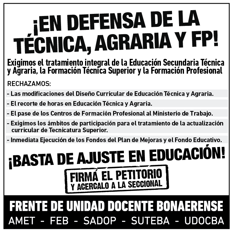Asimismo, exigimos la inmediata ejecución de los Fondos del Plan de Mejoras y el Fondo Educativo para sostener el funcionamiento de la Educación Técnico Profesional.