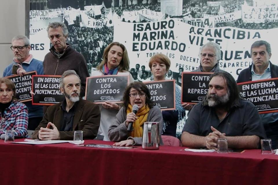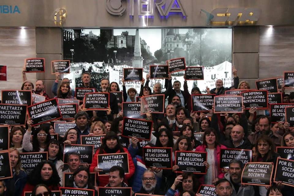Al finalizar la conferencia, lxs Docentes se dirigieron a Telam para llevar su solidaridad con todxs lxs despedidxs y exigir su reincorporación inmediata.