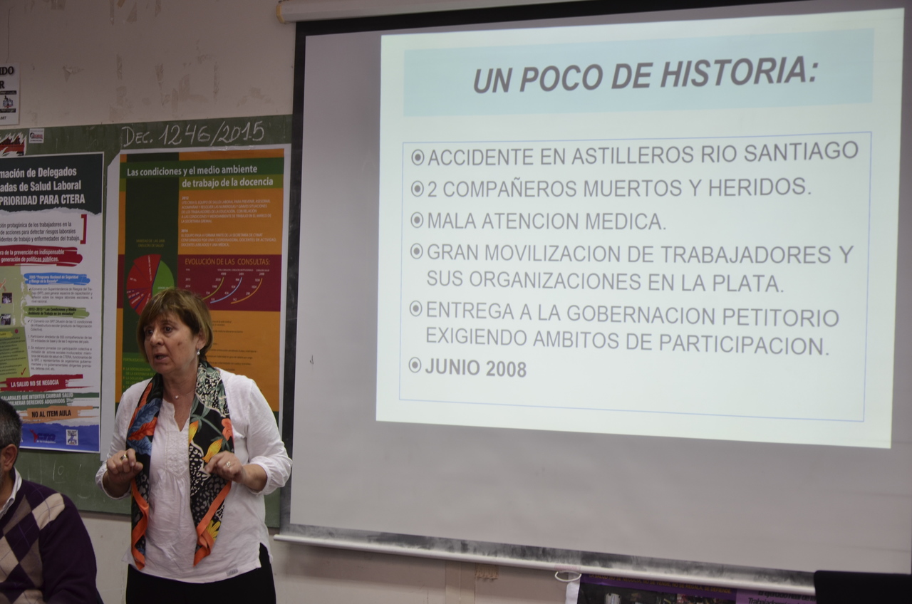 Luego, llegó el turno del panel "¿A qué nos referimos los trabajadores cuando hablamos de Condiciones de Trabajo y su impacto en la Salud?, integrado por Lilian Capone, Secretaria de Salud Laboral CTA Provincia de Buenos Aires, quien fue reconocida por todos los presentes por su importante aporte en la organización de este evento. Capone afirmó sobre la temática: "Este encuentro nos tiene que hacer reflexionar a todos los gremios para trabajar por una Ley de Prevención de Riesgo, por una ley que proteja totalmente nuestra salud. Tenemos que generar propuestas superadoras de lo que hoy tenemos. Nosotros, desde nuestro lugar, queremos que el Estado se ocupe del trabajo que hoy realizan de manera ineficiente las ART, por eso decimos que la Ley de Riesgo no va más, tenemos que ir por una Ley de Prevención".