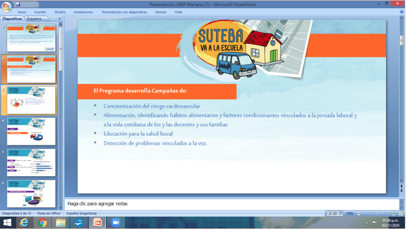 El jueves 5 de noviembre, la Secretaría de Salud del SUTEBA expuso parte de la experiencia acumulada en el Programa "SUTEBA va a la Escuela" en el marco de la Especialización en Medicina del Trabajo de la Universidad Nacional de Rosario (UNR).