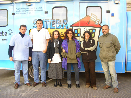 El equipo está compuesto por una médica generalista, una fonoaudióloga y un odontólogo. “Para realizar las recorridas, en el caso de Bahía por ejemplo se eligieron escuelas céntricas y también periféricas donde es muy difícil llegar y no están acostumbradas a este contacto” explicó el Responsable del Centro de Salud de Bahia Blanca y zona Sur de la provincia de Buenos Aires, Claudio León.Claudio León expresó: “Previamente a la recorrida visitamos a las escuelas , socializamos la política de salud que venimos desarrollando en los centros de salud, y les explicamos a los compañeros que si bien teníamos requerimientos de un montón de escuelas sobre cuestiones de salud y habíamos instrumentado charlas y talleres sobre alimentación saludable, cuidados de la voz, históricamente nos dimos cuenta que la mayoría de las escuelas, si bien compartían la misma problemática, no nos hacían ninguna consulta y que tenían los problemas de salud ocultos. No tenían conciencia de compartir problemas de salud con otras escuelas que sí hacían requerimientos a los centros de salud”, explicó.“Por eso se había instrumentado desde el año 2006 esta Campaña de Prevención de Enfermedades, que en el año 2007 el primer móvil había comenzado a recorrer el conurbano bonaerense y en el año 2008 se había decidido realizarla en los distritos del interior con la adquisición de un segundo móvil. Se les explicaba los ejes de la campaña, que abarca tres enfermedades: cardiovasculares, porque son la principal causa de muerte en el mundo y en Argentina, fonoaudiológicas, porque son una de nuestras dos enfermedades profesionales, y los compañeros no toman conciencia de que la disfonía es una discapacidad laboral para nosotros, y las odontológicas”.“En el caso de las 3 enfermedades, se hacía fuerte hincapié en que son fácilmente modificables, prevenibles y no deberían tener el impacto que tienen en la actualidad. Son prevenibles con pequeños cambios de hábitos de alimentación, de actividad física y de higiene, por lo cual es necesario una toma de conciencia para intentar dejar de ser paciente y no esperar a que nos sorprenda la enfermedad, sino tratar de trabajar para conservar y mejorar nuestra salud”, detalló el Responsable del Centro de Salud, que también destacó que la campaña está dirigida para afiliados, no afiliados y afiliados de otros sindicatos.“Somos un sindicato que en vez de replicar el modelo médico hegemónico de salud, intentamos desarrollar un modelo preventivo de salud centrado fundamentalmente en la medicina general, que evalúa al paciente en su contexto social, familiar y laboral, y que deriva al especialista sólo en algunos casos puntuales supervisando el tratamiento como individuo integral.”