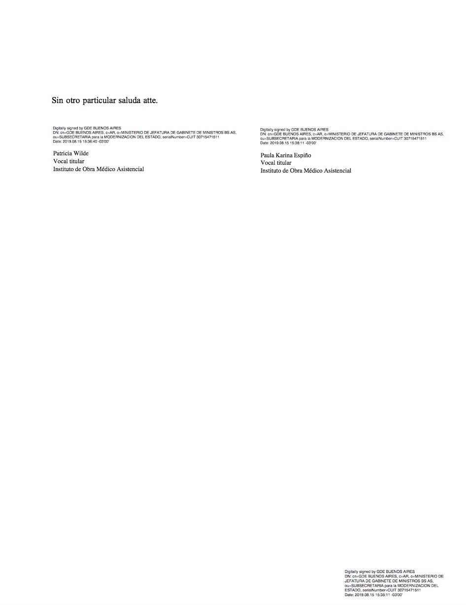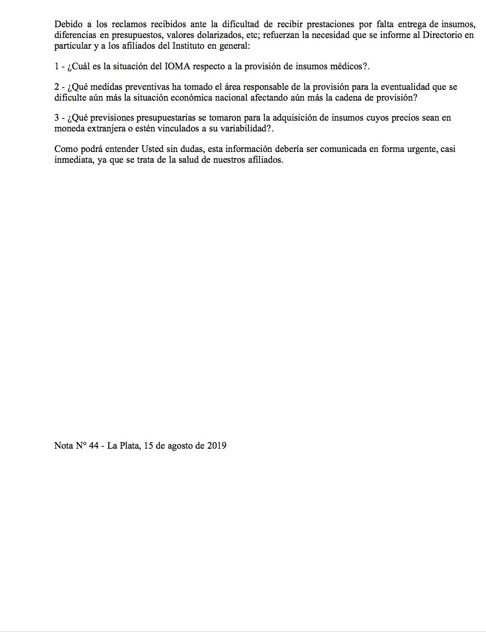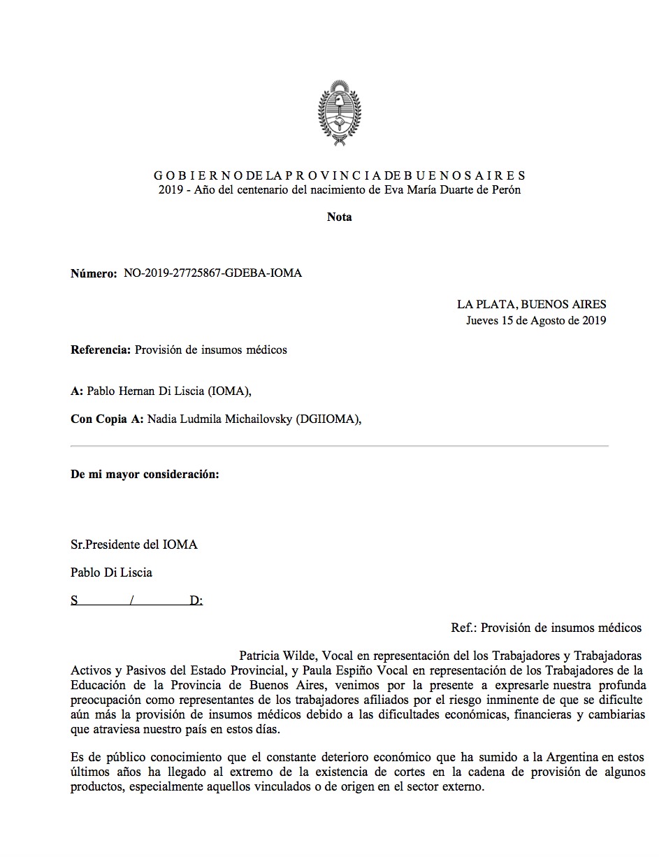 Paula Espiño, Vocal en representación de lxs Trabajadorxs de la Educación, y Patricia Wilde, Vocal en representación de lxs Trabajadorxs Activxs y Pasivxs del Estado Provincial, realizaron una presentación el jueves 15 de agosto expresando su preocupación por el riesgo inminente de que se dificulte aún más la provisión de insumos médicos. Dicha preocupación se funda en las dificultades económicas, financieras y cambiarias que atraviesa nuestro país en estos días.