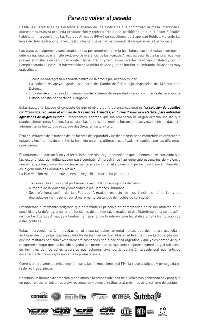 La CTA Provincia de Buenos Aires repudia categóricamente el anuncio realizado HOY por el presidente Mauricio Macri en Campo de Mayo, en el que plateó la puesta en marcha de "una reforma del sistema de Defensa. EN ESE ACTO HABILITÓ A LAS FUERZAS ARMADA A INTERVENIR en tarea de seguridad interior, modificando el Decreto Nº 727/2006, que limitó el rol de las Fuerzas Armadas.
