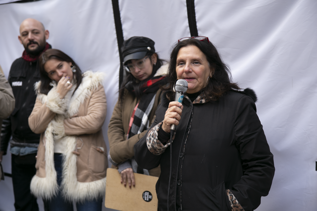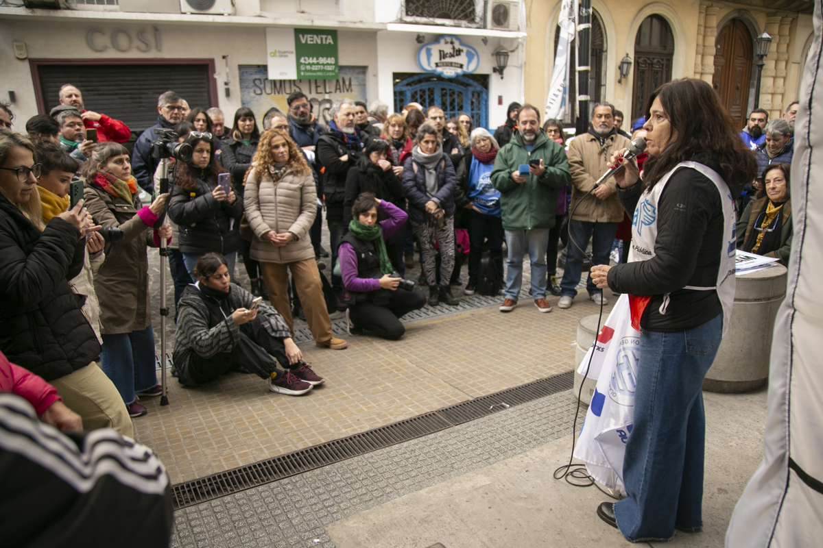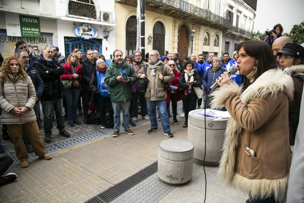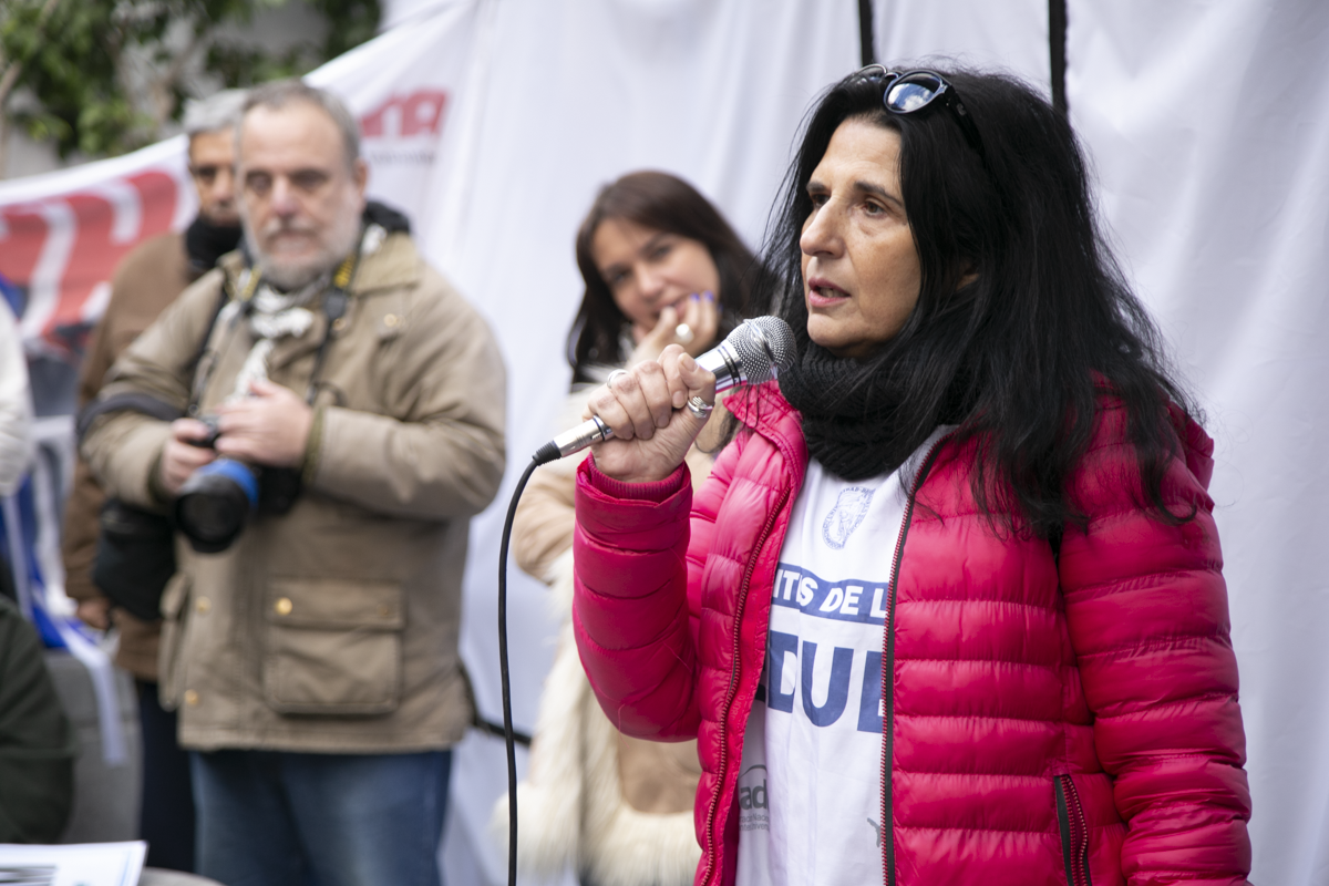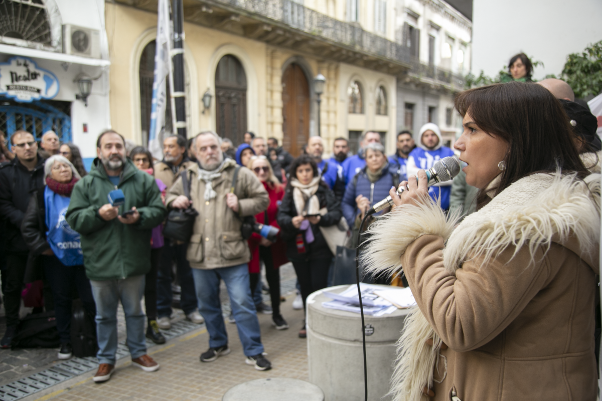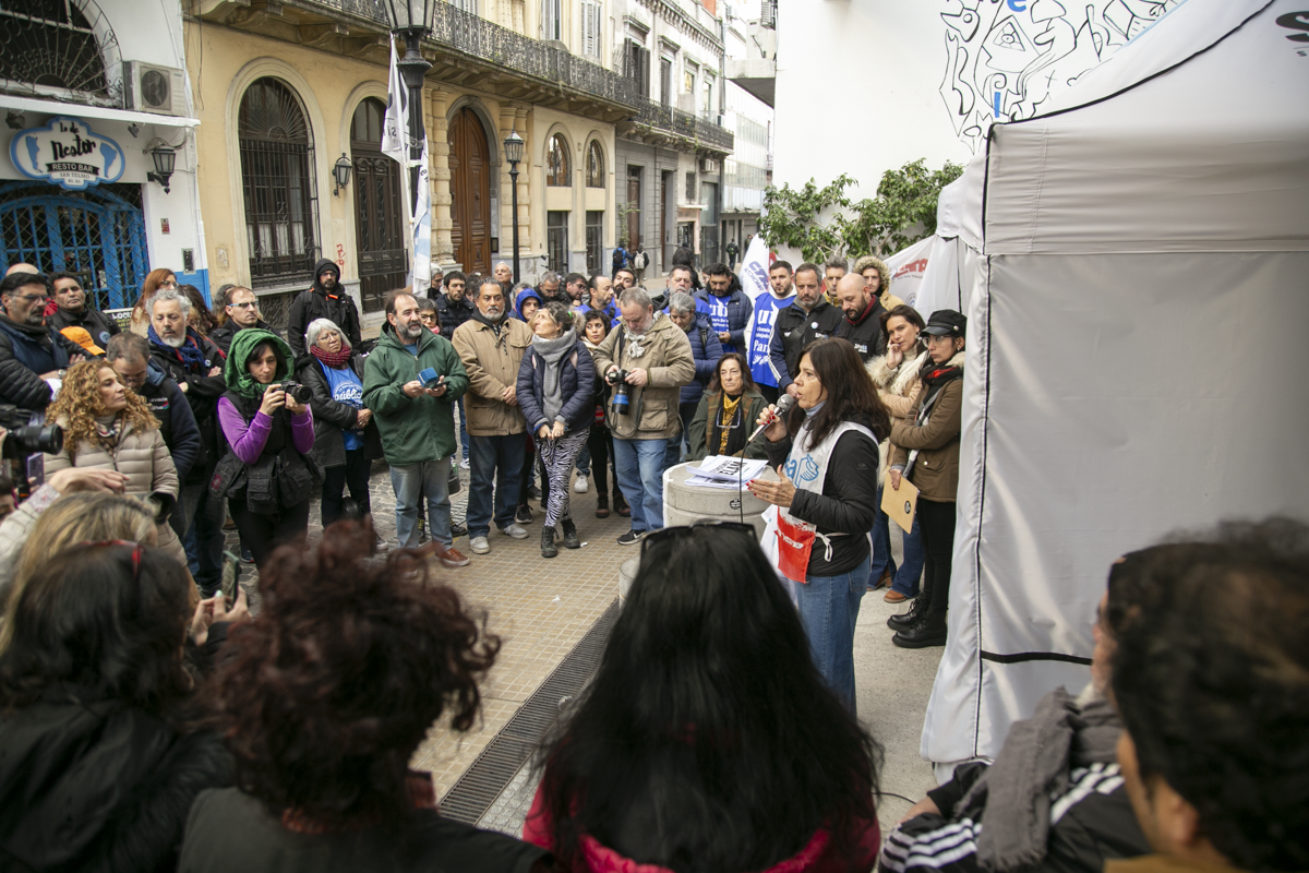 La Secretaria de Comunicaciones del SUTEBA, Elisa Semino, tomó la palabra en el escenario junto a otrxs representantes y sostuvo: "Estamos acá porque intentan darle un golpe a la libertad de expresión. Decimos que esto no será posible porque, desde la unidad con lxs Trabajadorxs de las Centrales Sindicales, apoyamos la lucha de lxs compañerxs de Télam. Frente a este Gobierno que intenta avanzar con la censura acallando voces, decimos una vez más que estamos defendiendo la libertad de expresión y a los medios públicos como Télam, TV Pública y Radio Nacional. No van a poder, porque del otro lado estamos nosotrxs, resistiendo como lo hicimos siempre con unidad, fuerza, convicción, dignidad y coraje".