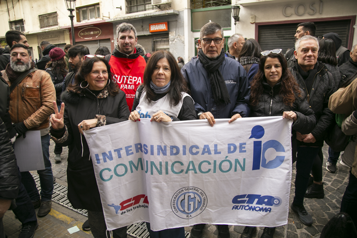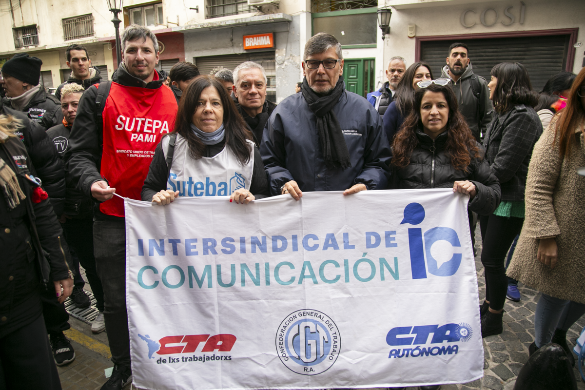 Las Intersindicales, conformadas por gremios de la CTA de lxs Trabajadorxs, la CGT y la CTA Autónoma, se hicieron presentes en la sede de la calle Bolívar para expresar su solidaridad con lxs compañerxs de la agencia y reafirmar que la defensa de Télam es la defensa de la soberanía informativa y de la Democracia.