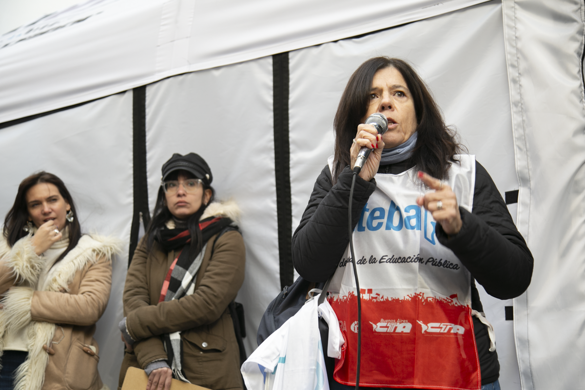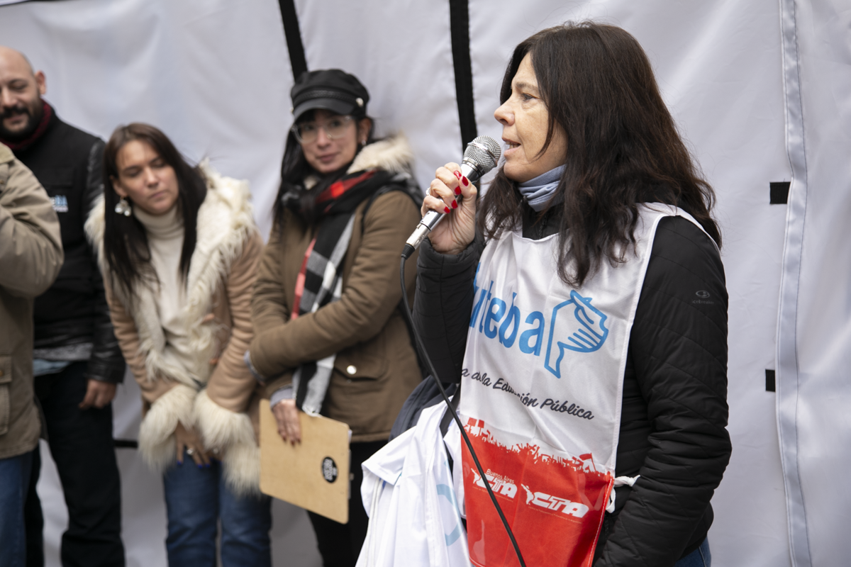 La Secretaria de Comunicaciones del SUTEBA, Elisa Semino, tomó la palabra en el escenario junto a otrxs representantes y sostuvo: "Estamos acá porque intentan darle un golpe a la libertad de expresión. Decimos que esto no será posible porque, desde la unidad con lxs Trabajadorxs de las Centrales Sindicales, apoyamos la lucha de lxs compañerxs de Télam. Frente a este Gobierno que intenta avanzar con la censura acallando voces, decimos una vez más que estamos defendiendo la libertad de expresión y a los medios públicos como Télam, TV Pública y Radio Nacional. No van a poder, porque del otro lado estamos nosotrxs, resistiendo como lo hicimos siempre con unidad, fuerza, convicción, dignidad y coraje".