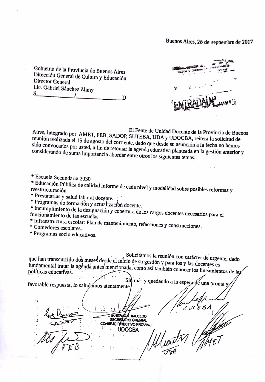 El Frente de Unidad Docente Bonaerense reitera la solicitada de reunión presentada el 15 de agosto, ya que desde la asunción del nuevo Director General de Educación y Cultura, Gabriel Sánchez Zinny, el FUDB no ha sido convocado.