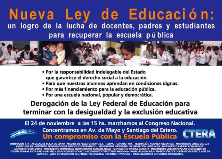 Durante más de diez años la resistencia de la docencia organizada en la CTERA y la lucha de la sociedad por la defensa de la Escuela Pública, construyeron la correlación de fuerzas que permitió derogar uno de los pilares de las políticas neoliberales de los 90: la Ley Federal de Educación. Al calor de esas luchas se fueron construyendo conceptos y propuestas alternativas, muchas de las cuales quedaron plasmadas en el texto de la Ley Nacional de Educación Nº 26.206, que se transforma así en plataforma de nuevas luchas para los trabajadores de la educación.
