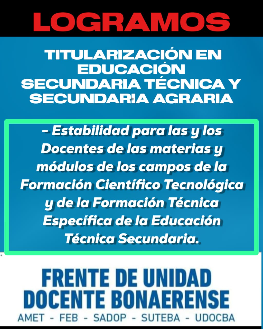 Este logro de la docencia organizada significa estabilidad laboral para lxs Docentes de materias y módulos de los campos de la Formación Científico – Tecnológica y de la Formación Técnica Secundaria.