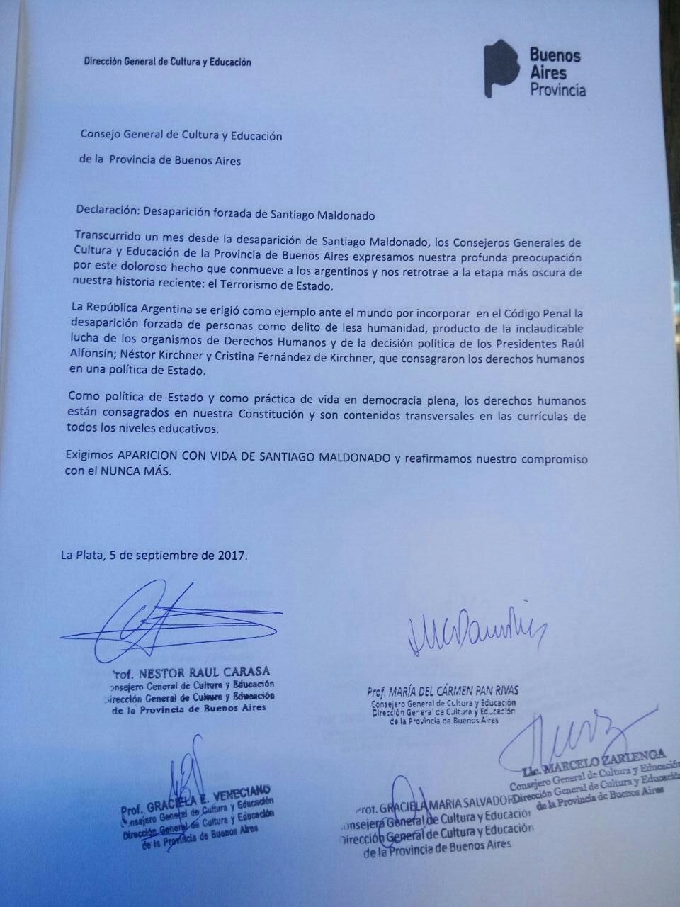 Los Consejeros Generales de Cultura y Educación de la DGCyE de la Provincia, espacio en el que Néstor Carasa y Marcelo Zarlenga representan al SUTEBA, firmaron una declaración expresando la profunda preocupación por la desaparición forzada de Santiago Maldonado. Rechazamos el intento de censura de las voces y miradas de Docentes, Estudiantes y de la Comunidad Educativa respecto a cómo debe tratarse el tema en todas las Instituciones Educativas de la Provincia.