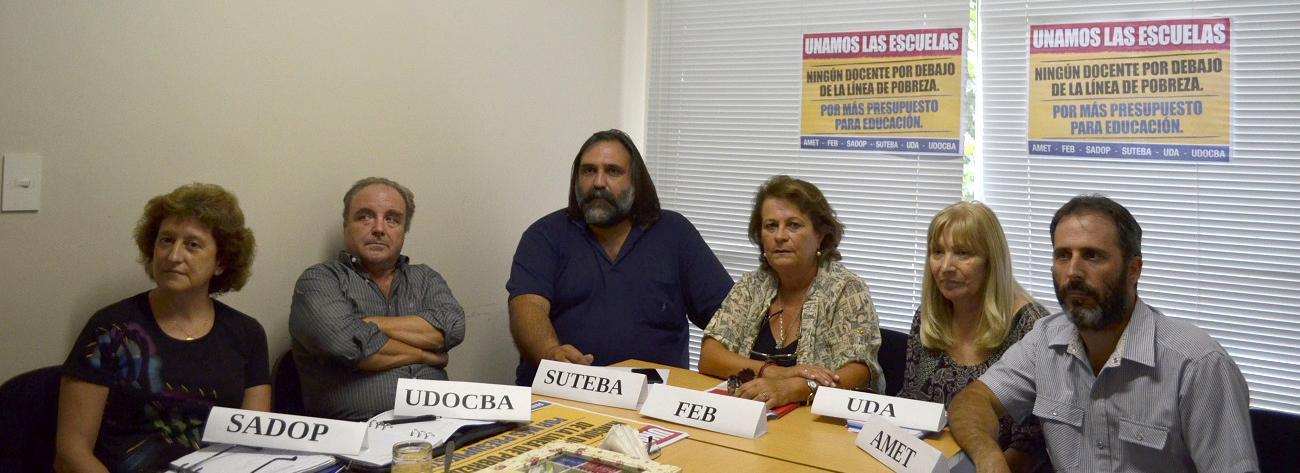 Los gremios docentes de Provincia de Bs. As. (AMET, FEB. SADOP, SUTEBA, UDA, UDOCBA) reunidos en el día de la fecha, lunes 13 de febrero, con el objetivo de analizar el conflicto educativo y consensuar acciones a desarrollar en el marco de la unidad planteamos: