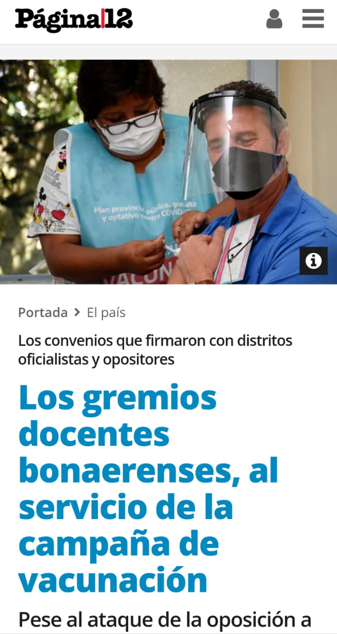 "La gente siempre sale agradecida después de ser vacunada", dijo a PáginaI12 el secretario general de STTEBA, Roberto Baradel, sobre cómo desde el gremio se sumaron a la campaña contra el coronavirus. Más allá de las críticas de algunos opositores, que se inscriben en la política general de horadar cualquier acción contra la expansión del virus, Baradel señaló que "Estamos convencidos que la solidaridad tiene que ser concreta. Y dio un ejemplo de cómo hacer el bien sin mirar a quién. El gremio firmó un convenio con la ciudad de La Plata, donde gobierna Juntos por el Cambio, para que el hotel del sindicato esté al servicio del municipio como Centro de Atención Intermedia. Es para las personas que se contagien de coronavirus que no puedan cumplir con el aislamiento en sus casas y tengan un grado no grave de problemas con la respiración", apuntó Baradel poniendo sobre la mesa que la salud de la población es más importante que las diferencias políticas.