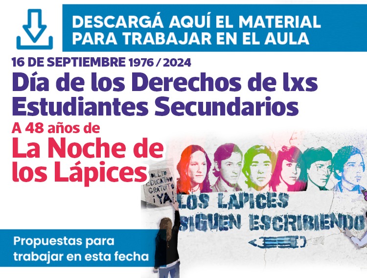 Este 16 de septiembre se cumplen 48 años de la denominada "NOCHE DE LOS LÁPICES". Por ello, y como cada año, en las Escuelas conmemoramos esta fecha referida a hechos dolorosos de nuestra historia reciente ocurridos durante la dictadura cívico militar del ‘76, en el marco del "Día de los Derechos de lxs Estudiantes Secundarixs".