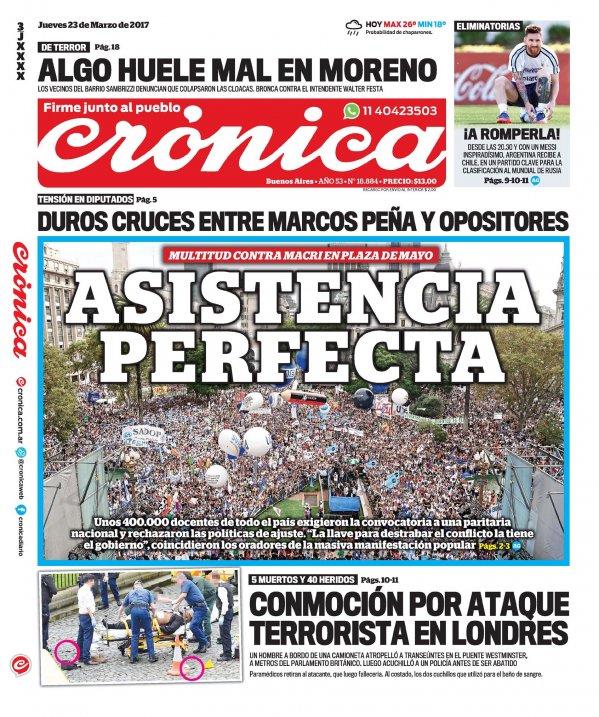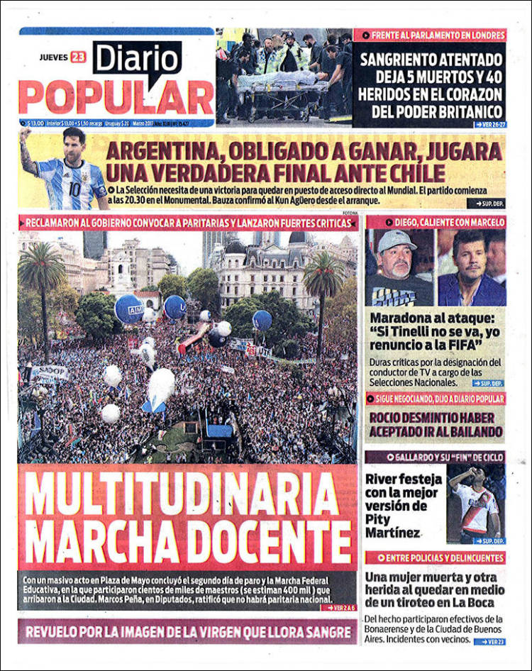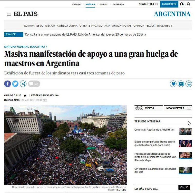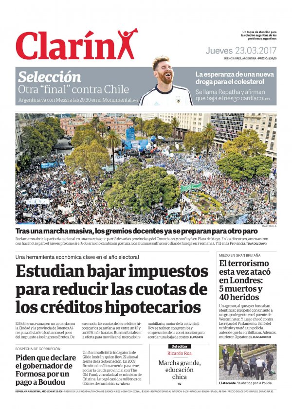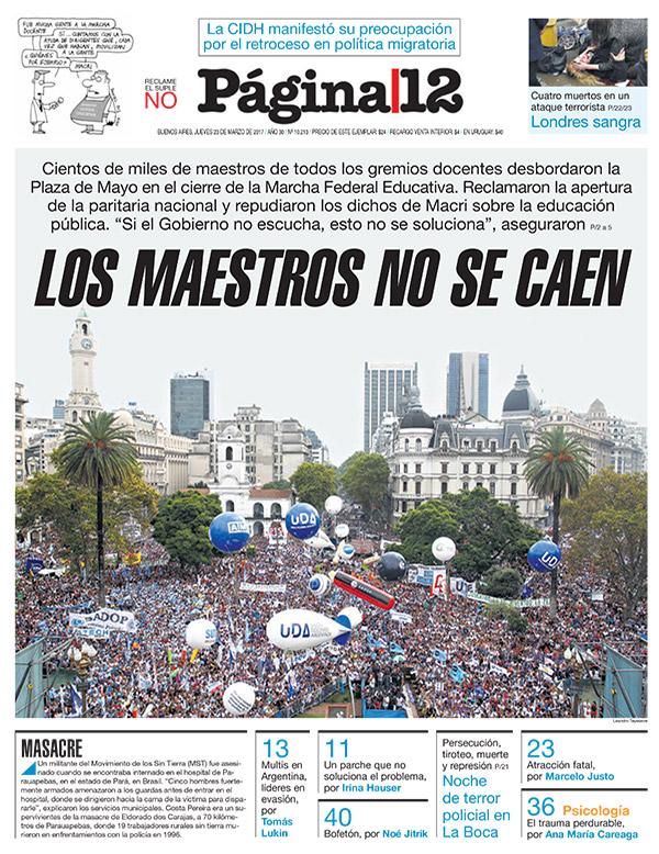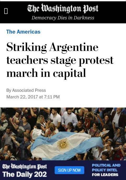 La Marcha Federal Educativa cruzó el país y llegó a distintas partes del mundo. La masividad, la emotividad, el corazón y la lucha hicieron de esta gran movilización una noticia central desde el día de ayer. Numerosos diarios nacionales, provinciales y hasta internacionales se hicieron eco de esta demostración de amor y defensa de la Escuela Pública y le dedicaron un lugar principal en la tapa. Este reclamo trascendió todos los límites, el país entero se calzó el guardapolvo y salió a las calles. 400.000 lecciones que el Gobierno Nacional debe escuchar #ParitariaNacionalYa.