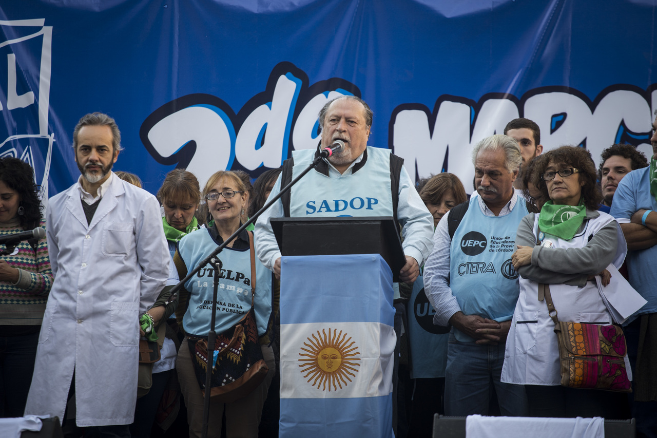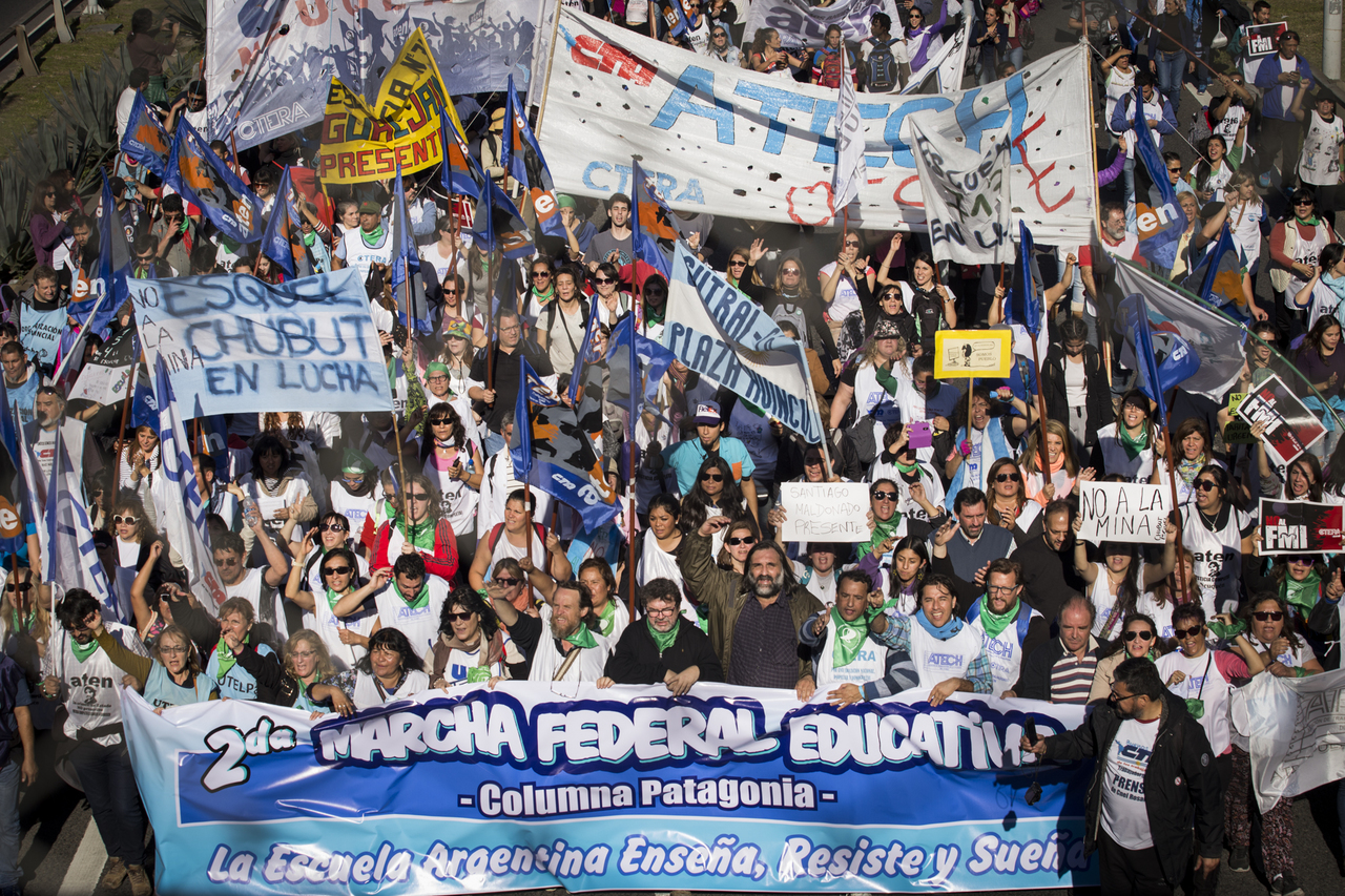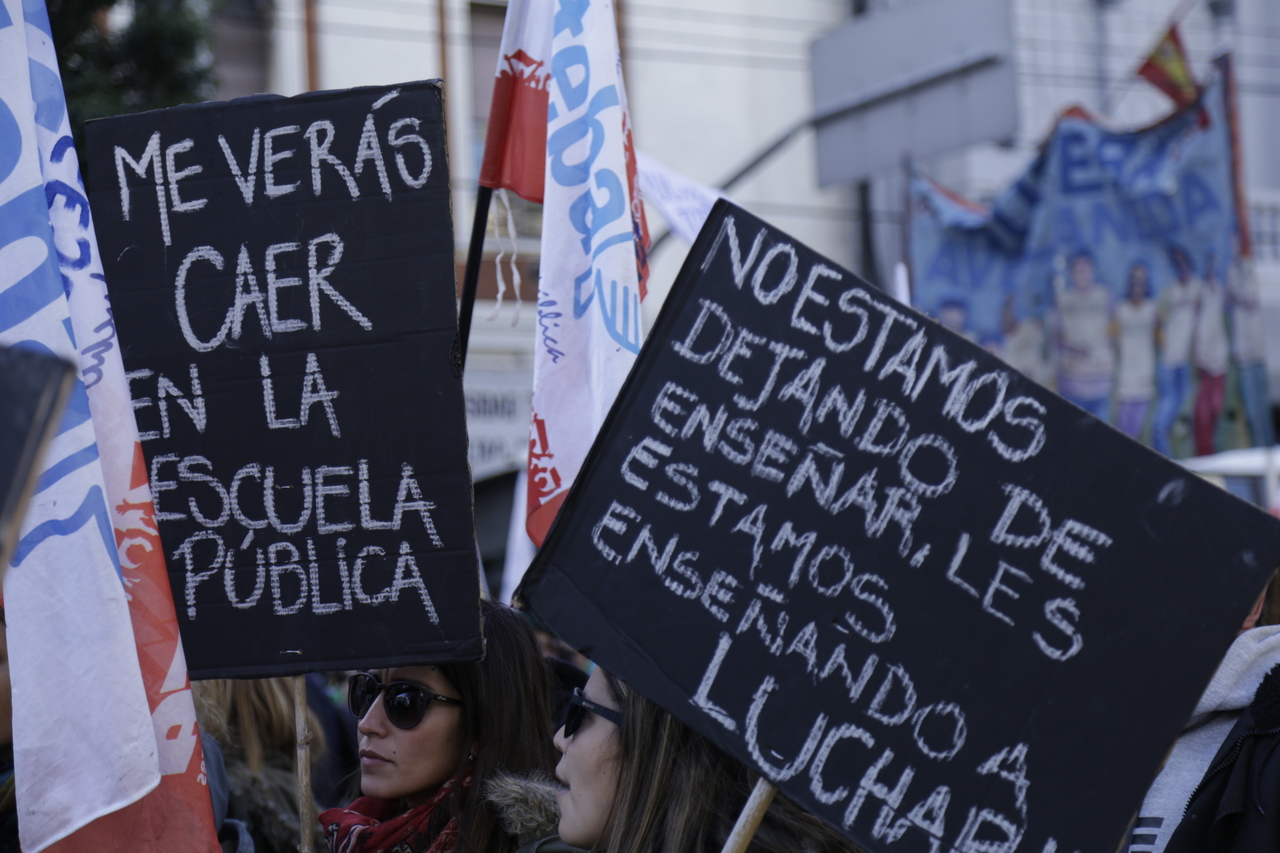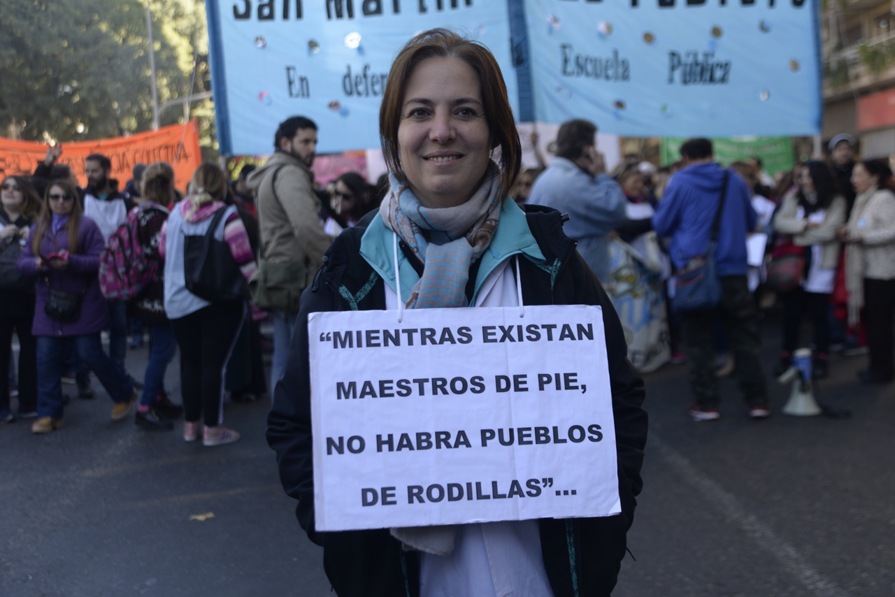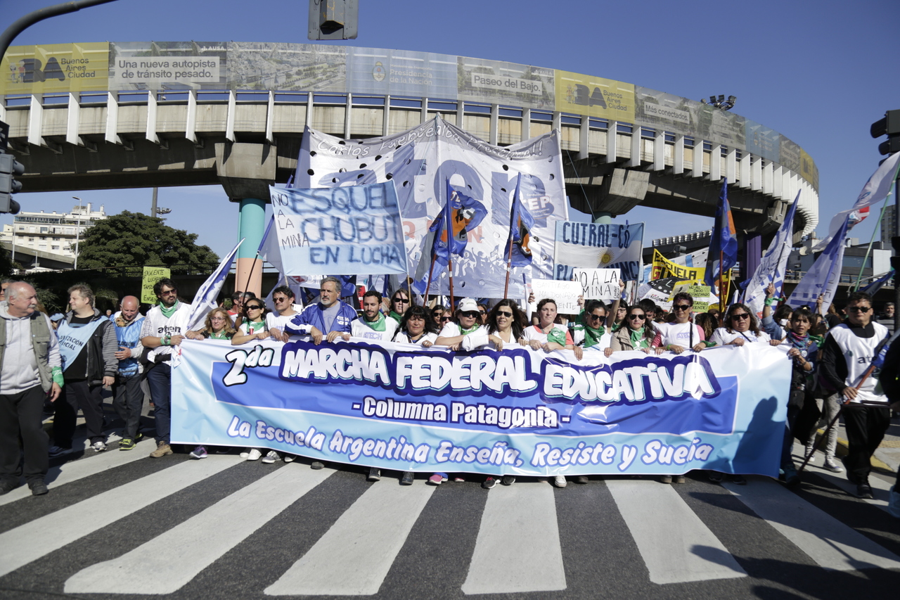 "Marchamos en nombre de nuestrxs 700 Maestrxs detenidxs y asesinadxs y de Carlos Fuentealba. Nos quieren volver a meter para adentro. Quieren que dejemos de pensar en los grandes destinos nacionales para que discutamos uno o dos temas. La discusión es sobre el modelo educativo, el modelo para esta Patria. Por eso gritamos Patria SI, Colonia NO. ¿Donde está Finnochiaro? ¿Dónde está la política educativa del gobierno? Nosotrxs queremos fortalecer la Educación Pública. Nosotrxs reivindicamos la Paritaria Nacional Docente y el Financiamiento Educativo. Fuimos, somos y seremos un Sindicato dispuesto a luchar en defensa de nuestros Derechos y a construir la unidad de clase para vencer este modelo", finalizó Alesso.