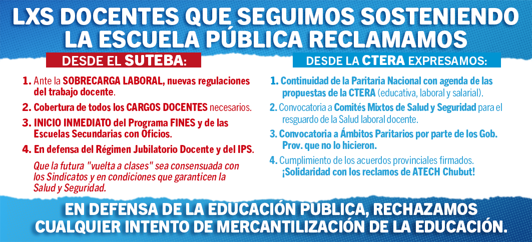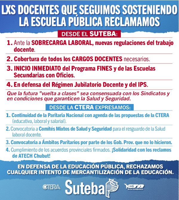 En el marco de este contexto de pandemia y Aislamiento Social, Preventivo y Obligatorio; lxs Docentes que seguimos sosteniendo la Escuela Pública reclamamos: