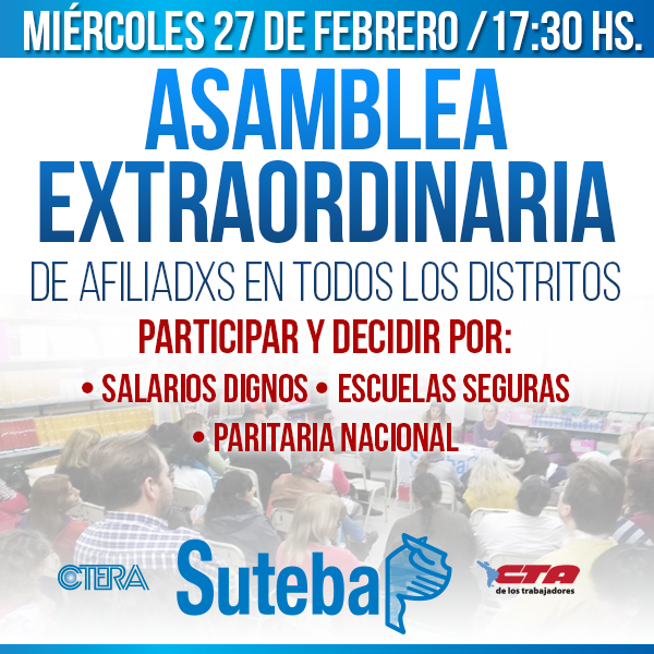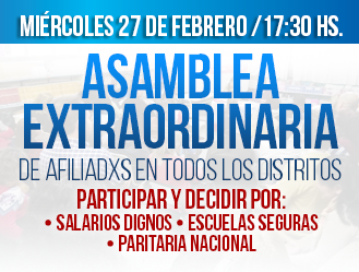 El miércoles 27 se desarrollarán Asambleas Extraordinarias de afiliadxs en todos los distritos de la Provincia, a partir de las 17:30 hs. El temario a tratar será sobre la situación nacional y provincial de la Educación y las medidas de acción a realizar.