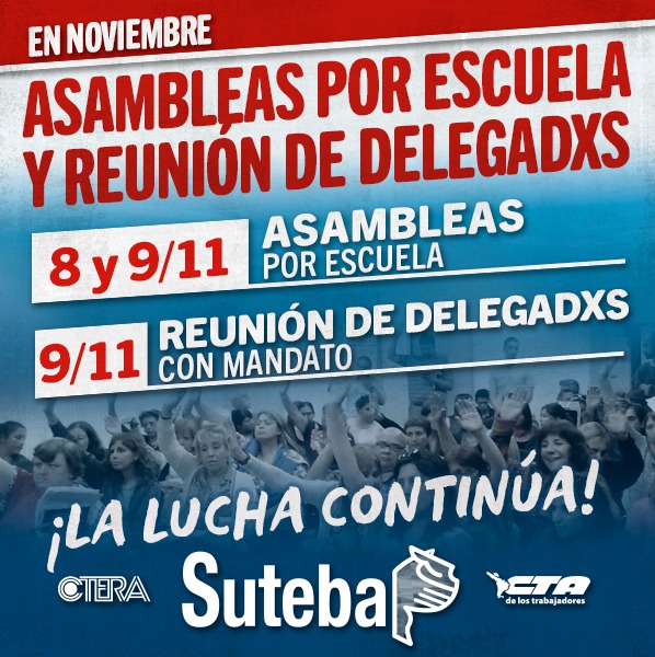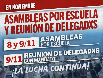 El jueves 8 y viernes 9 de noviembre, realizaremos Asambleas en las Escuelas de la Provincia. El viernes 9, lxs Delegadxs se reunirán con el mandato de lxs Docentes, expresando su voz y la decisión colectiva, ante el abandono de la Escuela Pública y la desidia de la Gobernadora María Eugenia Vidal.
