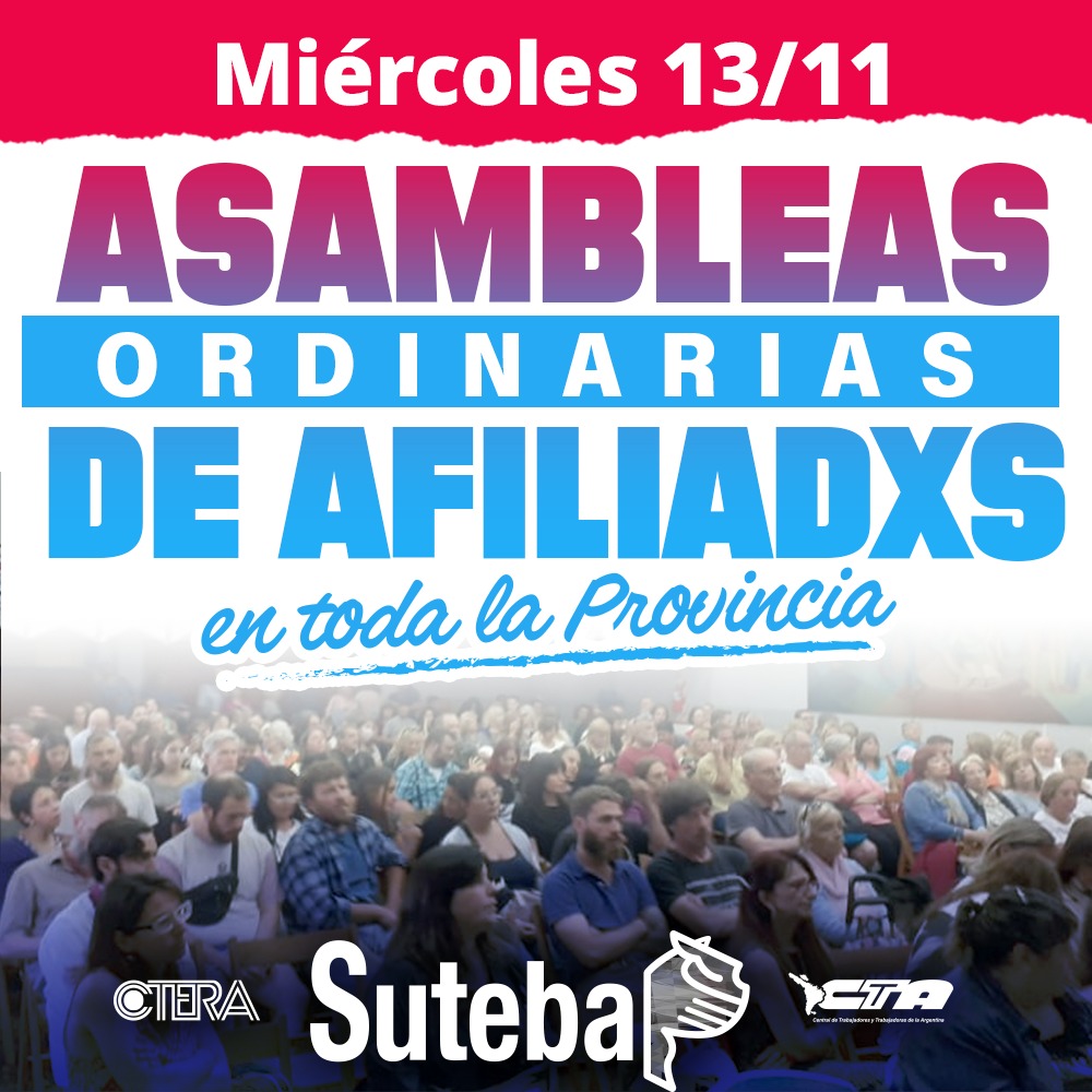 Una vez más, por este nuevo período, el SUTEBA convocó oportunamente en tiempo y forma a la realización de Asambleas Ordinarias de Seccional en toda la Provincia para el día de mañana, miércoles 13 de noviembre, a las 17:30 hs.