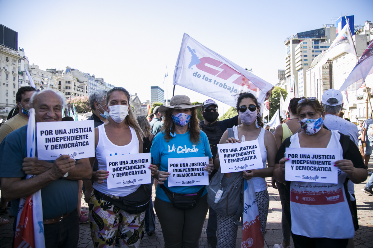 Silvia Almazán, Secretaria General Adjunta del SUTEBA, sostuvo que "para nosotros, Trabajadores y Trabajadoras de la Educación, tanto en el marco del SUTEBA como de la CTA, esta movilización es muy importante porque aporta a consolidar la democracia. Demandar que haya una Justicia independiente y democrática es fundamental para garantizar nuestros derechos, salir de la pantalla en la que nos dejaron las políticas neoliberales, el proyecto de Macri y de Vidal, y poder avanzar en que haya más garantías, más derechos para el conjunto de nuestro pueblo, particularmente para Trabajadores y Trabajadoras".