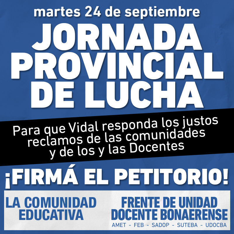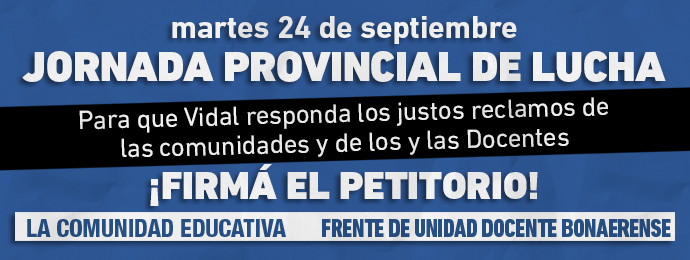 El martes 24 de septiembre, lxs Trabajadorxs de la Educación y las comunidades educativas realizarán una Jornada Provincial de lucha, convocadxs por el Frente de Unidad Docente Bonaerense, con actividades en todos los distritos.