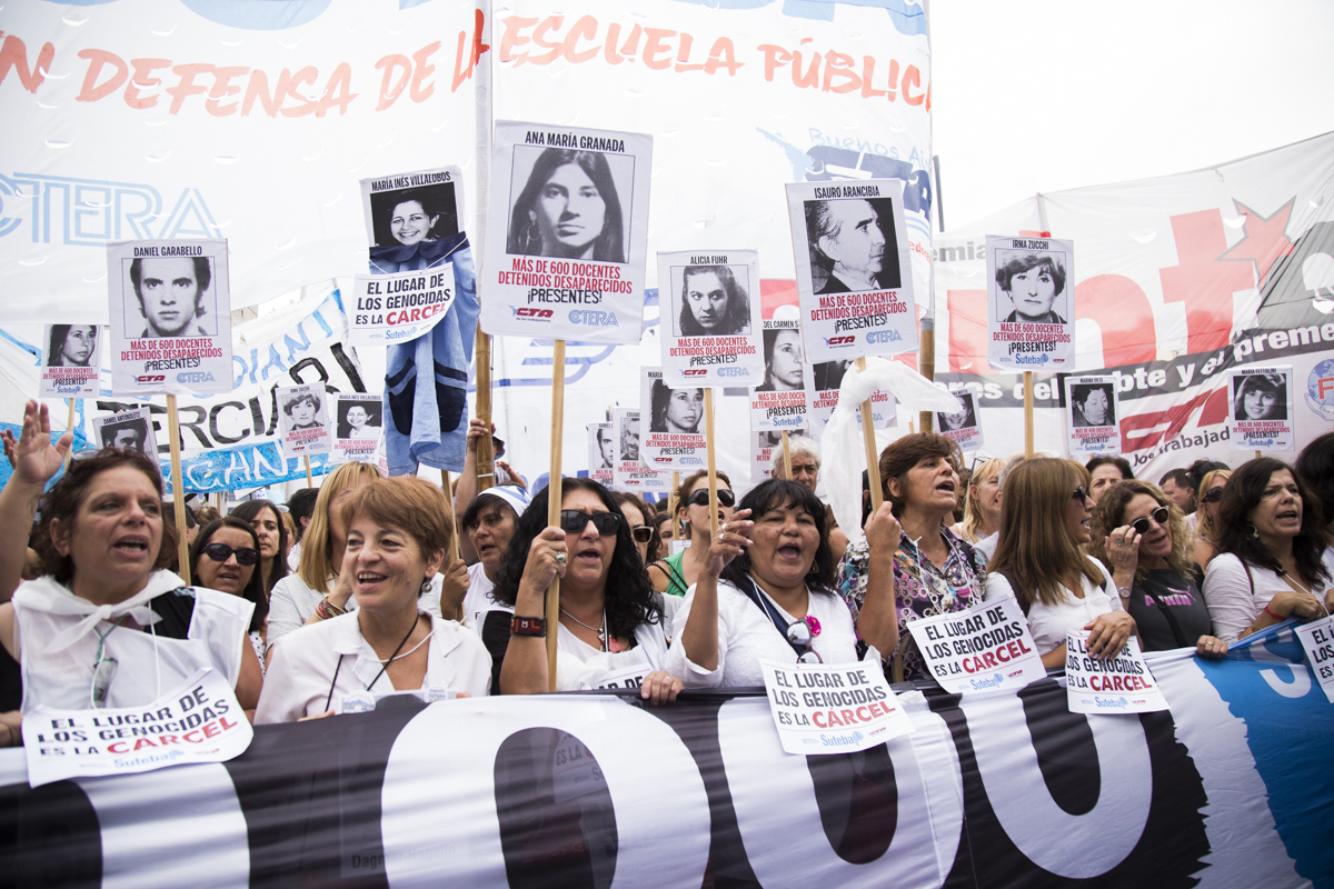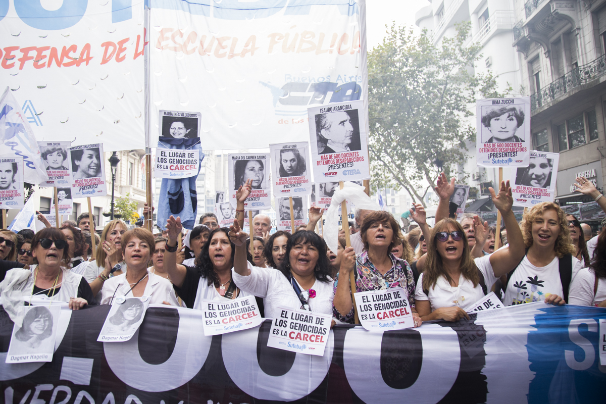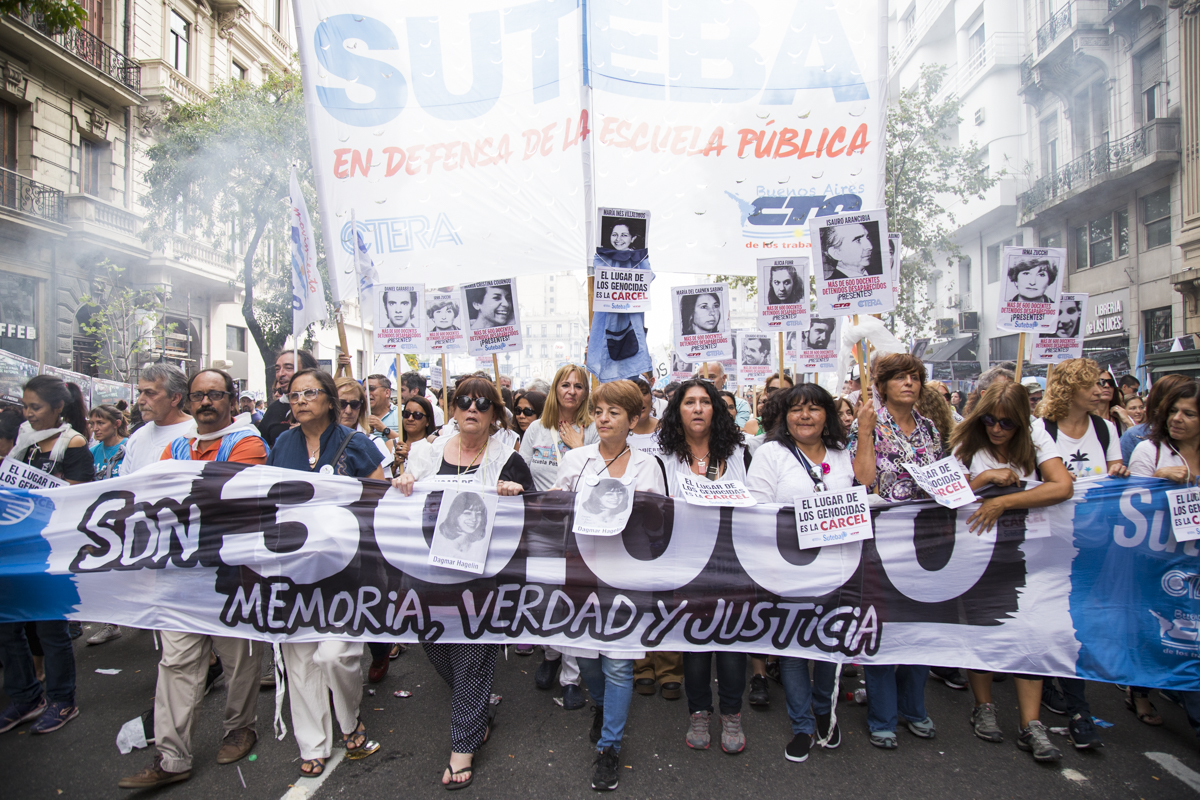 En esta nueva marcha, repudiamos el terrorismo de estado como lo hacemos cada día desde nuestras Escuelas con lxs estudiantes y levantamos con cada pañuelo la bandera de nuestrxs 30.000, reafirmando que EL ÚNICO LUGAR PARA UN GENOCIDA ES LA CÁRCEL.