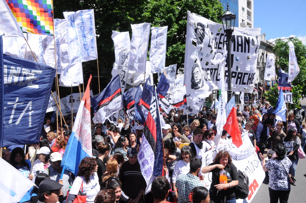 La marcha arrancó a las 11 de Plaza Rocha y en su primer parada en la cartera de Desarrollo Social los manifestantes volvieron a reclamar la regularización del sistema de comedores escolares, el impulso de los planes de asistencia para niñez y adolescencia.